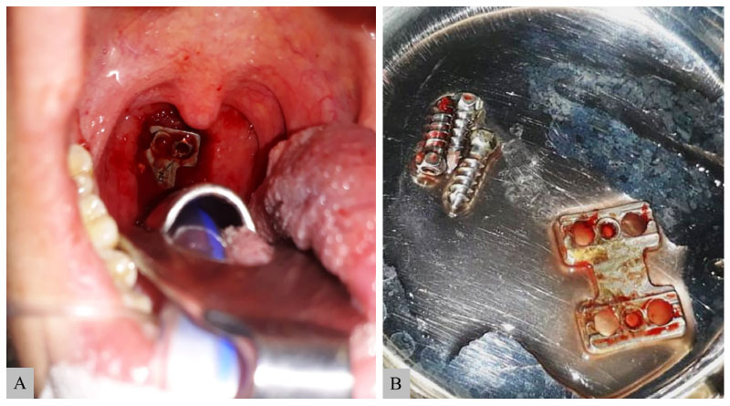 Figure 1: Preoperative view of oropharynx. A) Erosion of the oropharyngeal mucosa and the anterior cervical plates and screws are visible. No evidence of mucosal infection is observed at the borders of the perforation. Removed material; B) Of the anterior fixation device (including plate and screws) at cervical revision surgery.