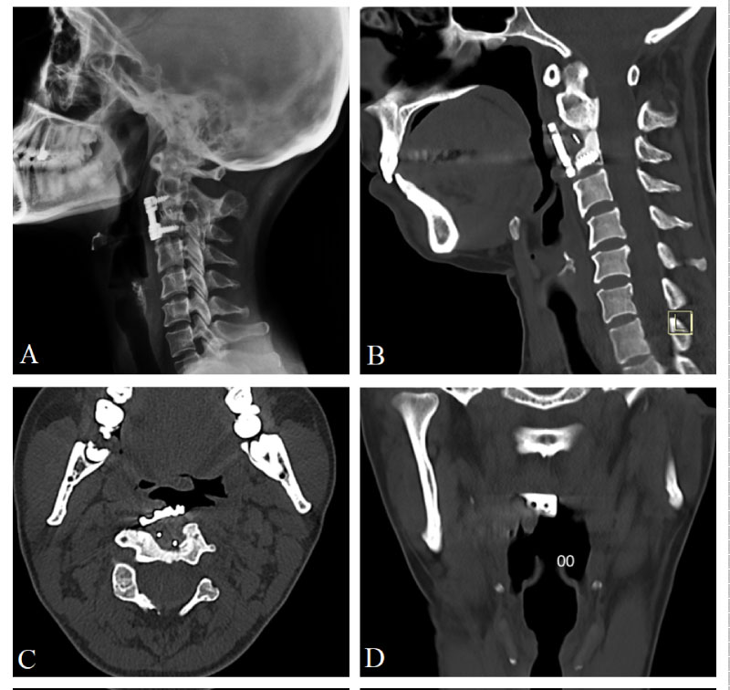 A 36-year-old female patient was admitted to our department with a diagnosis of traumatic listhesis at the C2-3 level after a motor vehicle accident. Neurological examination of the patient revealed no deficit. C2-3 anterior cervical discectomy, fusion with polyether ether ketone (PEEK) cage and anterior plate-screw fixation surgery were performed. After eight years from surgery, the patient presented to our clinic with dysphagia. On examination, she had a sore throat for the past few weeks and had a foreign body sensation in her throat. Fiber optics pharyngoscopy was used in physical examination, and mucosal erosion was seen in the oropharyngeal region. Anterior cervical plate was visible on the posterior wall of the pharynx (Figure 1A) and there was no appearance of abscess formation or inflammation. Cervical vertebra X-ray (Figure 2A) and CT (Figure 2B) revealed fusion at the C2-3 level, but also a perforation of the pharynx wall due to the fixation device (Figure 2C and Figure 2D). As the patient had adequate fusion, it was concluded that there was no need for re-stabilization surgery. Therefore, surgery was planned for removal of fixation device and repair of the pharyngeal wall. During surgery, the oral cavity did not allow manipulation with a screwdriver (Figure 1B). The margins of the pharyngeal mucosa in the perforation area were seemed to be healthy (Figure 1A). So, the anterior cervical approach was applied instead of transoral approach and fixation device was removed. Broad-spectrum antibiotics and total parenteral nutrition were used in the treatment of pharynx perforation, and the wound was left to healing with secondary intention. The patient was followed up in the hospital for two weeks. During this period the symptoms of dysphagia improved, and she was discharged. In 12 weeks after discharge, the primary repair of the pharynx with removal of fixation device was failed although any infection did not occur. Since the healing was insufficient despite 12 week-period and to prevent secondary infection, the otolaryngology team has repaired the pharyngeal perforation surgically by turning the mucosal flap. The patient is currently being followed up without symptom.