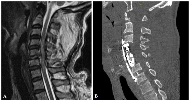 Figure 3: Preoperative MRI of the patient in the sagittal plane. A) Showing traumatic posterior C5-6 disc herniation, diffuse spinal cord edema and 2 mm epidural fluid collection at C3-7 levels. Postoperative cervical CT; B) Showing C4-5 corpectomies (and fusion with a distractible cage) and C5-6 discectomy (and fusion with a PEEK cage) and stabilization with anterior plate and screws.