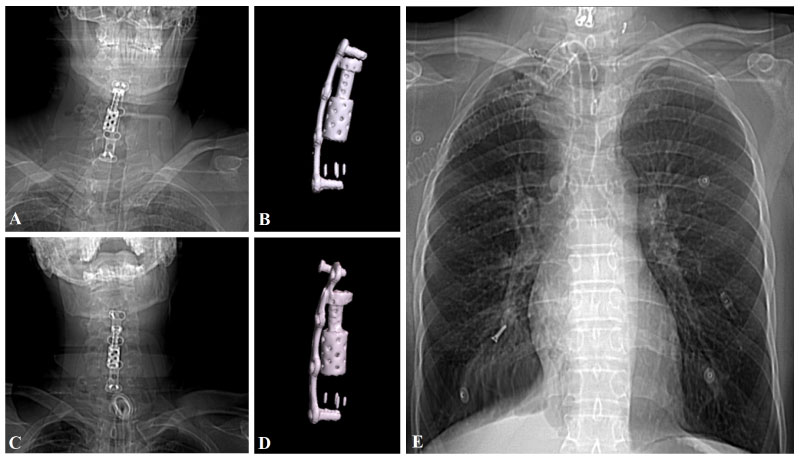 A 44-year-old male patient was admitted to the emergency department for spinal cord injury after a motor vehicle accident. His neurological examination revealed tetraplegia. Spinal radiological imaging revealed diffuse spinal cord edema (Figure 3A) and 2 mm epidural collection at C3-7 levels. Hemodynamic stabilization of the patient who has a spinal shock state was provided in the neuro-intensive care unit. C4-5 corpectomy and C6-7 discectomy were performed urgently to provide spinal decompression. The fusion was achieved using a distractible cage and a PEEK cage (Figure 3B). Anterior plate stabilization was performed (Figure 4A and Figure 4B). The patient's follow-up and treatment continued in the neuro-intensive care unit with the support of mechanical ventilation. Two months after the operation, a screw was detected in the right lung distal bronchus in the routine PA chest X-ray (Figure 4E). Spinal imaging revealed that the upper left screw which was fixed to the C3 corpus was not in place (Figure 4C and Figure 4D) and that it had migrated to the thoracic cavity after creating a perforation in the pharyngeal wall. The patient underwent rigid bronchoscopy, and the screw was removed. Upper fixation screws were revised and stabilized surgically. Since the patient had a tracheostomy and receives the enteral tube feeding, the pharyngeal perforation was left to secondary wound healing. The patient was referred to the physical therapy center after three months from the operation.