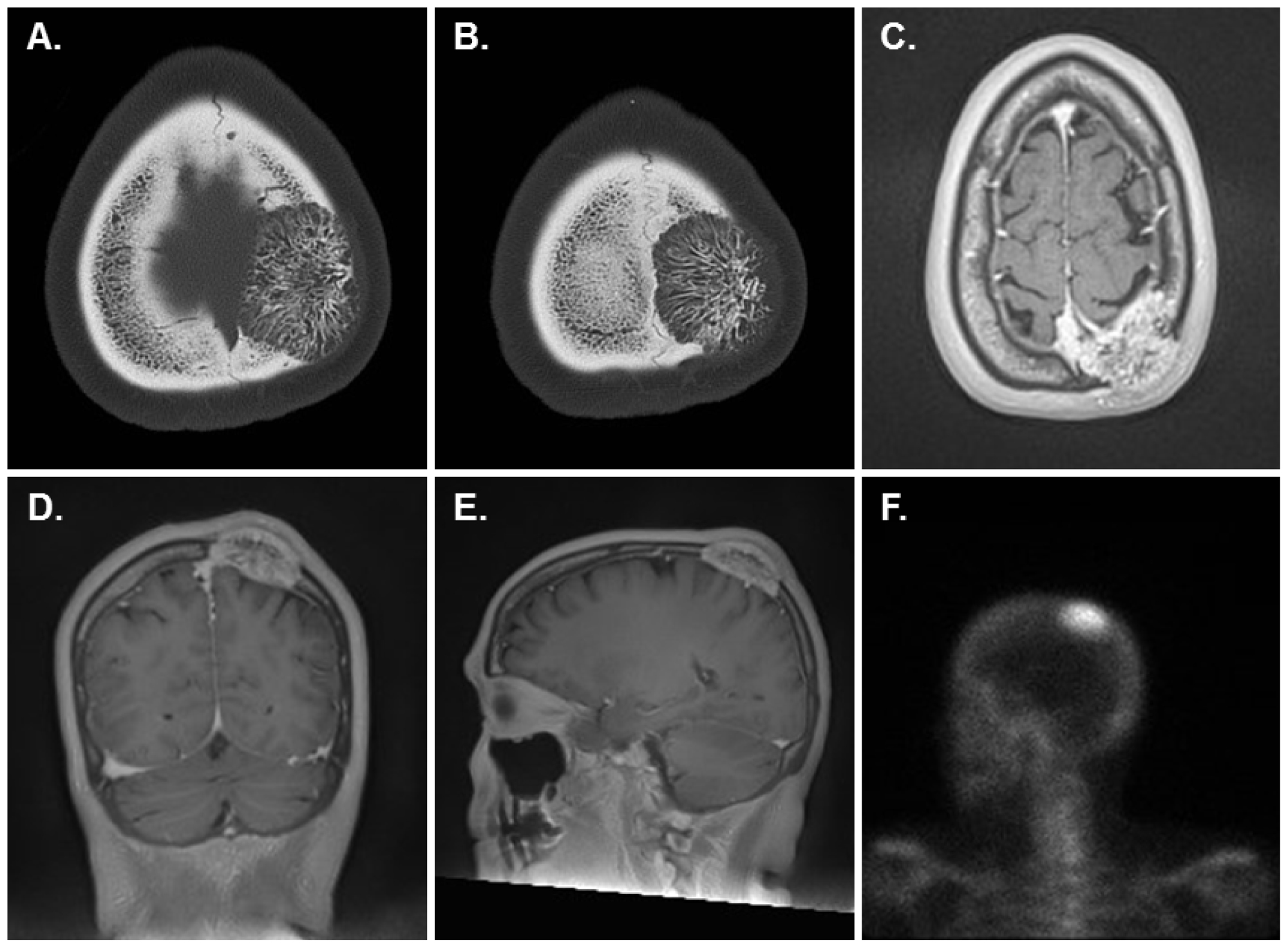 A 61-year-old female with hypertension and arthritis, as well as a history of both squamous cell carcinoma and basal cell carcinoma, was referred to our institute for evaluation of an enlarging palpable left frontoparietal bone lesion. Six months prior to presentation, the patient hit her head on a closet rail and subsequently noted a lump on the left frontoparietal aspect of her scalp. She was then followed up with CT and MRI of the brain with and without contrast, revealing a growing expansile, striated, enhancing lesion in the left frontoparietal cranial bone, which appeared to abut the superior sagittal sinus. The lesion disrupted the inner and outer tables of the cranial bone and indented the extra-axial space of the left frontoparietal region with extension outside of the cortex into the soft tissues. There was no evidence of cerebral parenchymal involvement, except for cerebral compression (Figure 1A, Figure 1B, Figure 1C, Figure 1D and Figure 1E). The differential diagnosis including metastatic disease or an atypical hemangioma was radiologically considered. Subsequently, a total body bone scan was also performed and only revealed this solitary lesion in the skull (Figure 1F). Given the rapid growth and etiological uncertainty of the bone lesion, a left frontoparietal craniectomy for complete resection of the mass with subsequent cranioplasty was performed. The excised lesional skull bone was sent for histopathological examination. Clinical follow-up with the patient showed no recurrence of this tumor.