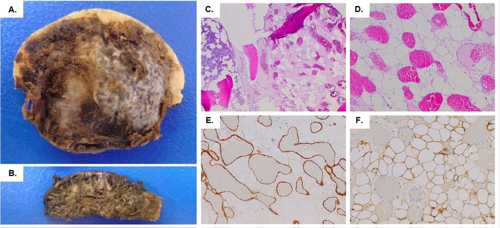 Figure 2: Resected left frontoparietal mass and microscopic findings. A) The specimen grossly consisted of an oval portion of cranium with a raised area on the convex surface; B) Upon sectioning, the cut surface revealed a dark red-gray appearance spanning the entire thickness of the bone and raised area; C, D) Histologically, the calvarial mass was composed of mature adipose tissue and disorganized thin-walled blood vessels (H&E, C: 40X, D: 100X); E, F) The immunophenotype was positive for CD34 staining the vascular endothelium (E, 100X). and S100 highlighting the adipocytes (F, 100X).