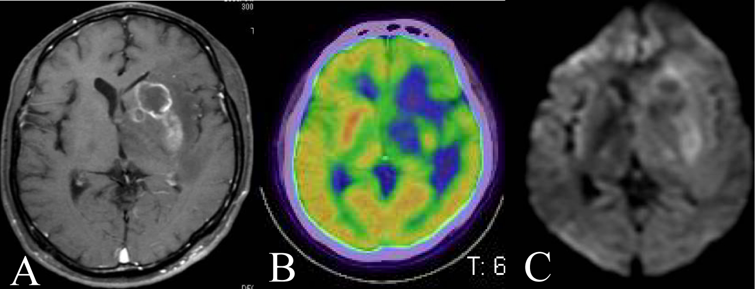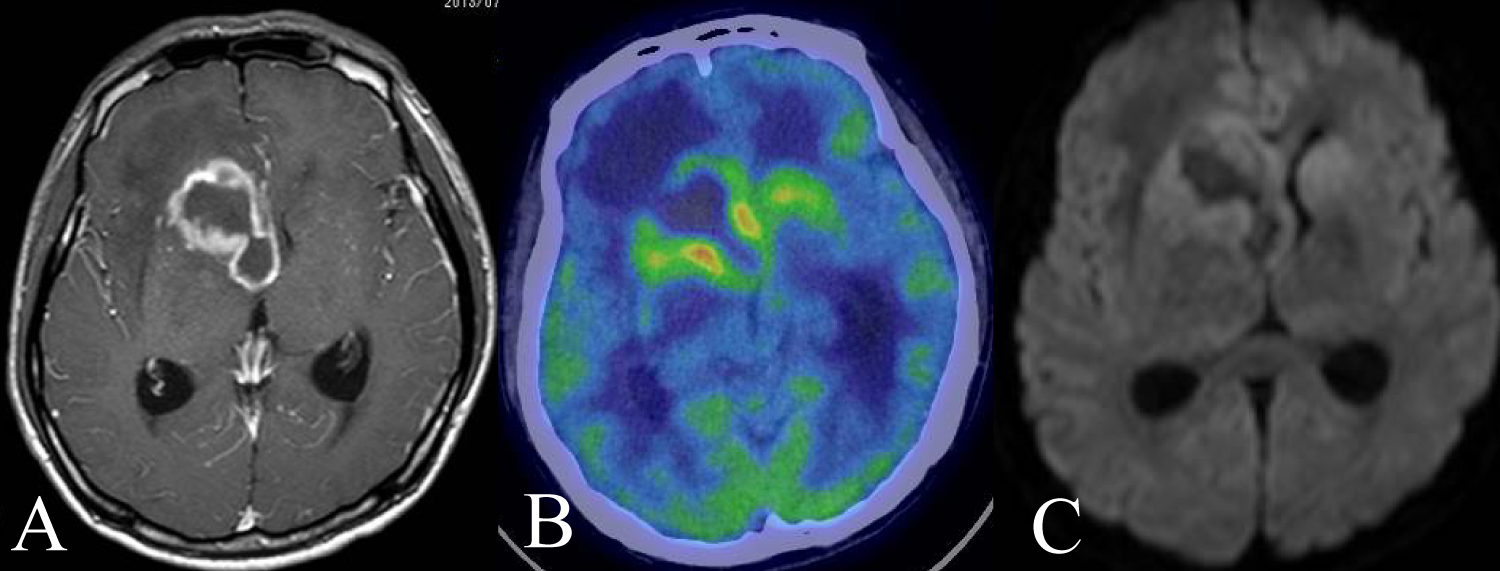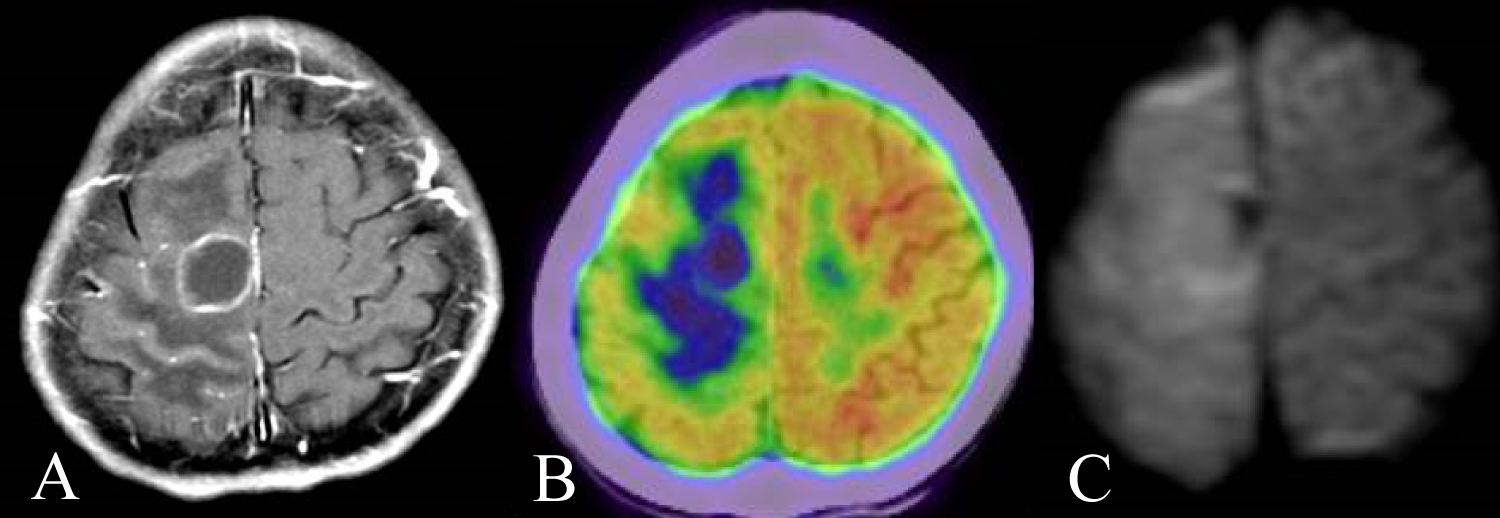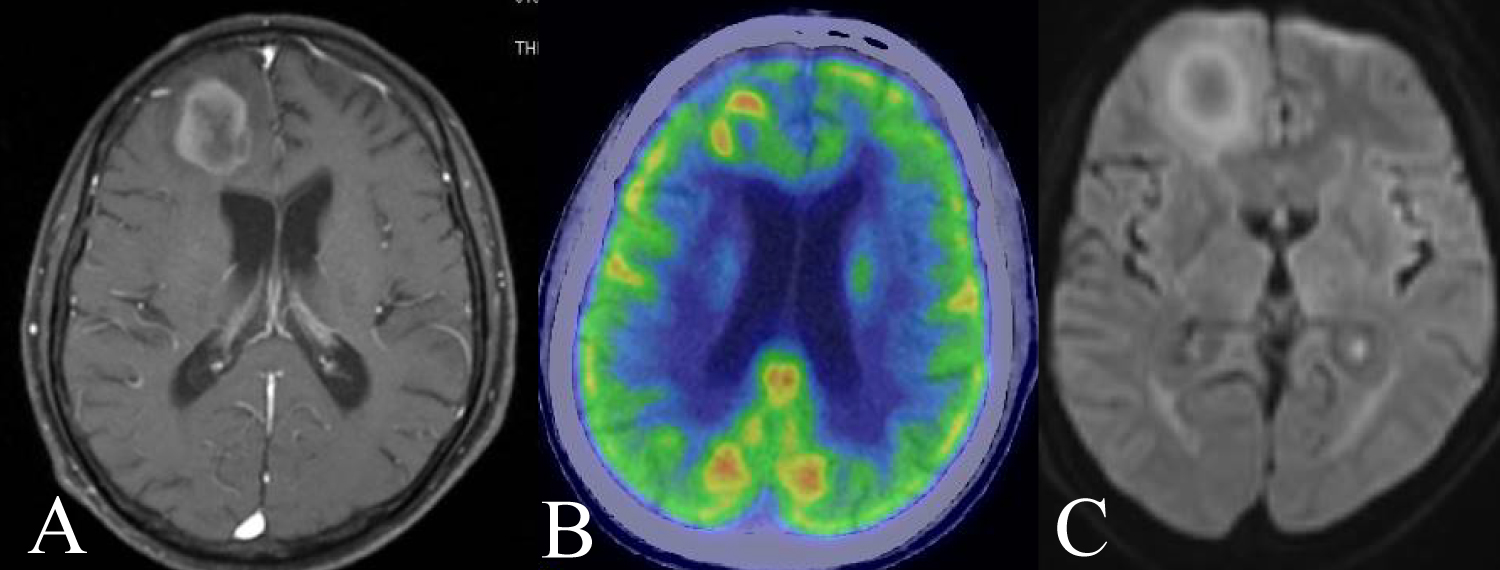 Figure 5: A 52 year-old man presented his character changed. A) His head MRI showed a ring enhancement at right frontal lobe; B) FDG-PET showed ring like high uptake and central low uptake at same lesion; C) DWI showed slight ring like high intensity.