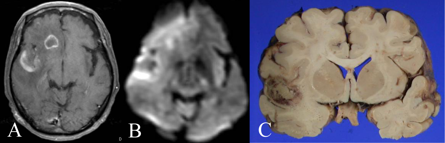 Figure 2: A 67 year-old man presented dysarthria and dysphagia. A) His head contrast MRI showed two ring enhancement lesions in both right frontal and temporal lobe; B) DWI showed no clear findings; C) His autopsy specimen showed central necrosis at the ring enhancement lesion of contrast MRI.