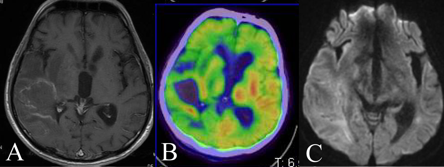 Figure 4: A 36 year-old man was unconscious in his house. A) His head MRI showed a ring enhancement at right temporal lobe; B) FDG-PET showed central low uptake and peripheral moderate or high uptake; C) DWI showed no clear findings.