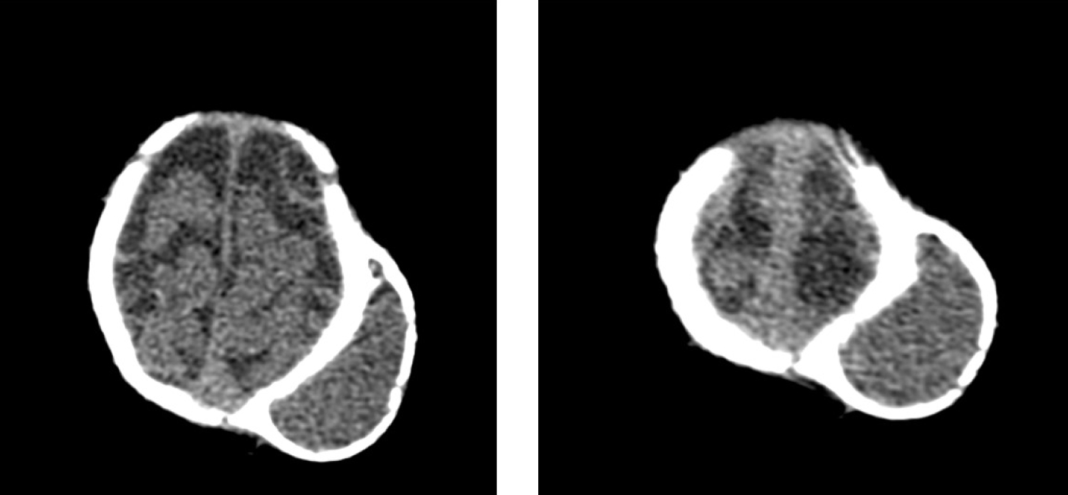 A 40-day-old female baby was admitted to the hospital with 7 × 8 cm hard left parietal mass. She was delivered vaginally using forceps and the mass was growing since birth. The patient was neurologically intact and blood tests for coagulation disorders were normal.