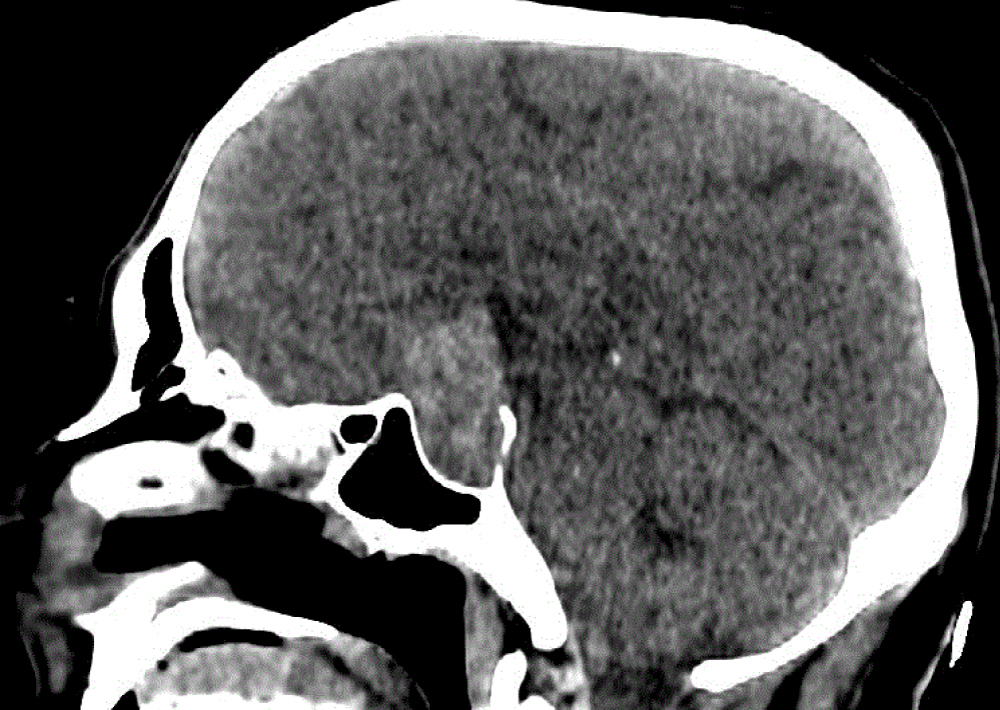 Figure 1: Sagittal CT scan showing a large sellar and suprasellar with intrinsic hemorrahage mass lesion.