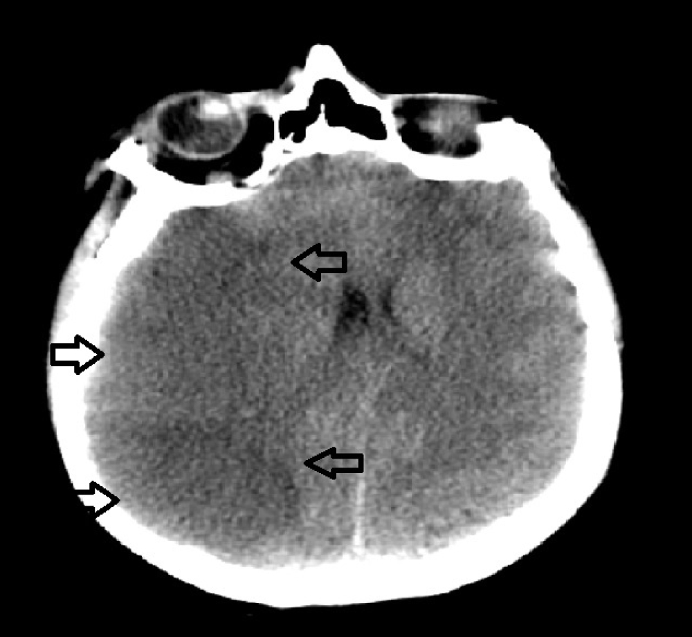 Figure 3: Post-operative axial CT scan showing right temporoparietal infarcts and brain edema.