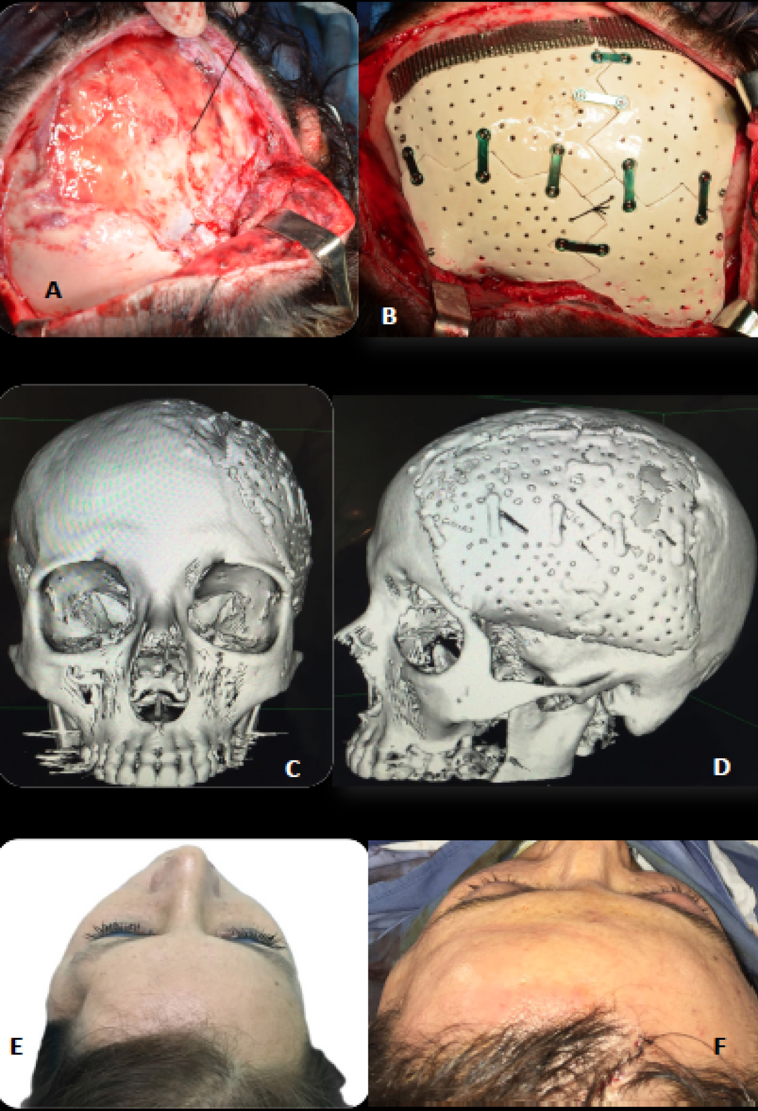 Figure 2: (A) Left hemicoronal approach and cranial defect exposure. Dura mater and suspensory suture are observed; (B) Customized PEEK prosthesis installed and fixed with 1.5 mm osteosynthesis plates and screws. There is also a reinforcement with titanium mesh; (C and D) Tridimentional reconstruction of control computed tomography (CT) with a customized PEEK prosthesis in the correct position (front and side views); (E) Preoperative cranial defect; (F) Cranial defect in the immediate post-operative period.