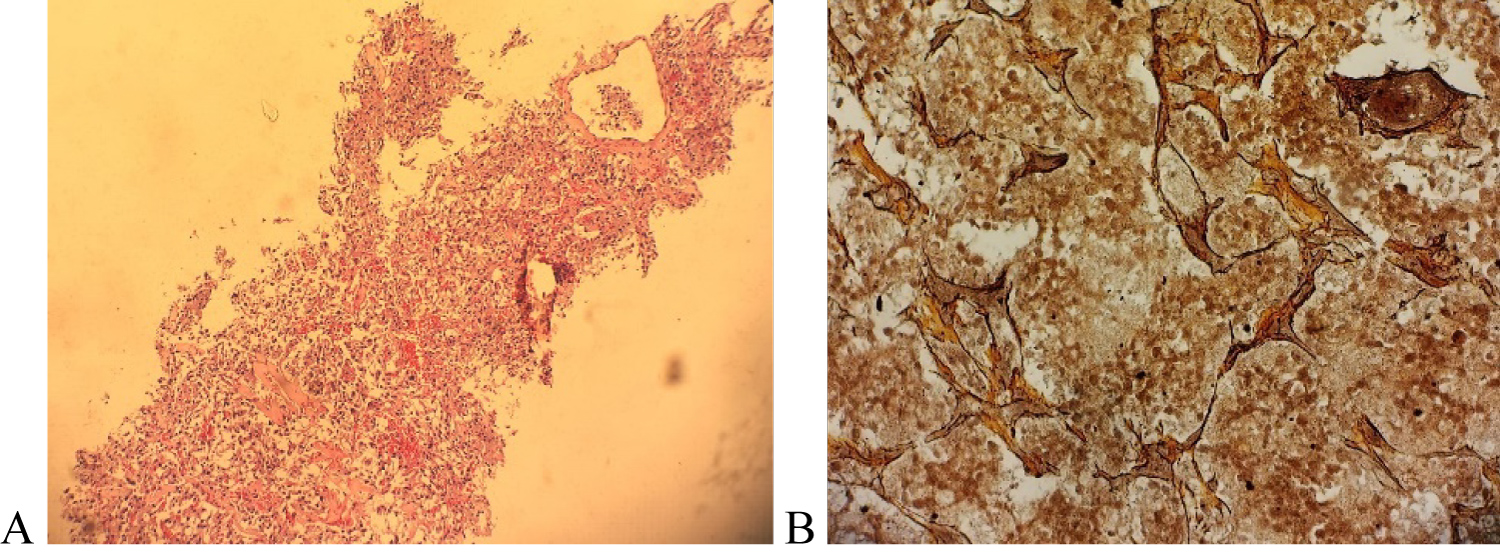Figure 4: (A) Microscopic (histology) image of specimen showing nests of cells with moderately pleomorphic round nuclei within a prominent vasular network; (B) Immunohistochemical analysis demonstrating postive staining with reticulin (alveolar nesting pattern noted).