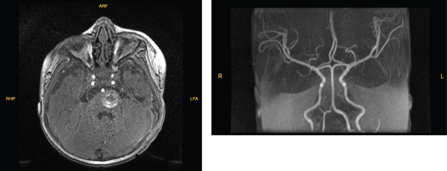 Figure 1: MR angiography showed a non-vascular lesion narrowing forth ventricle on the left part of pons. View Figure 1