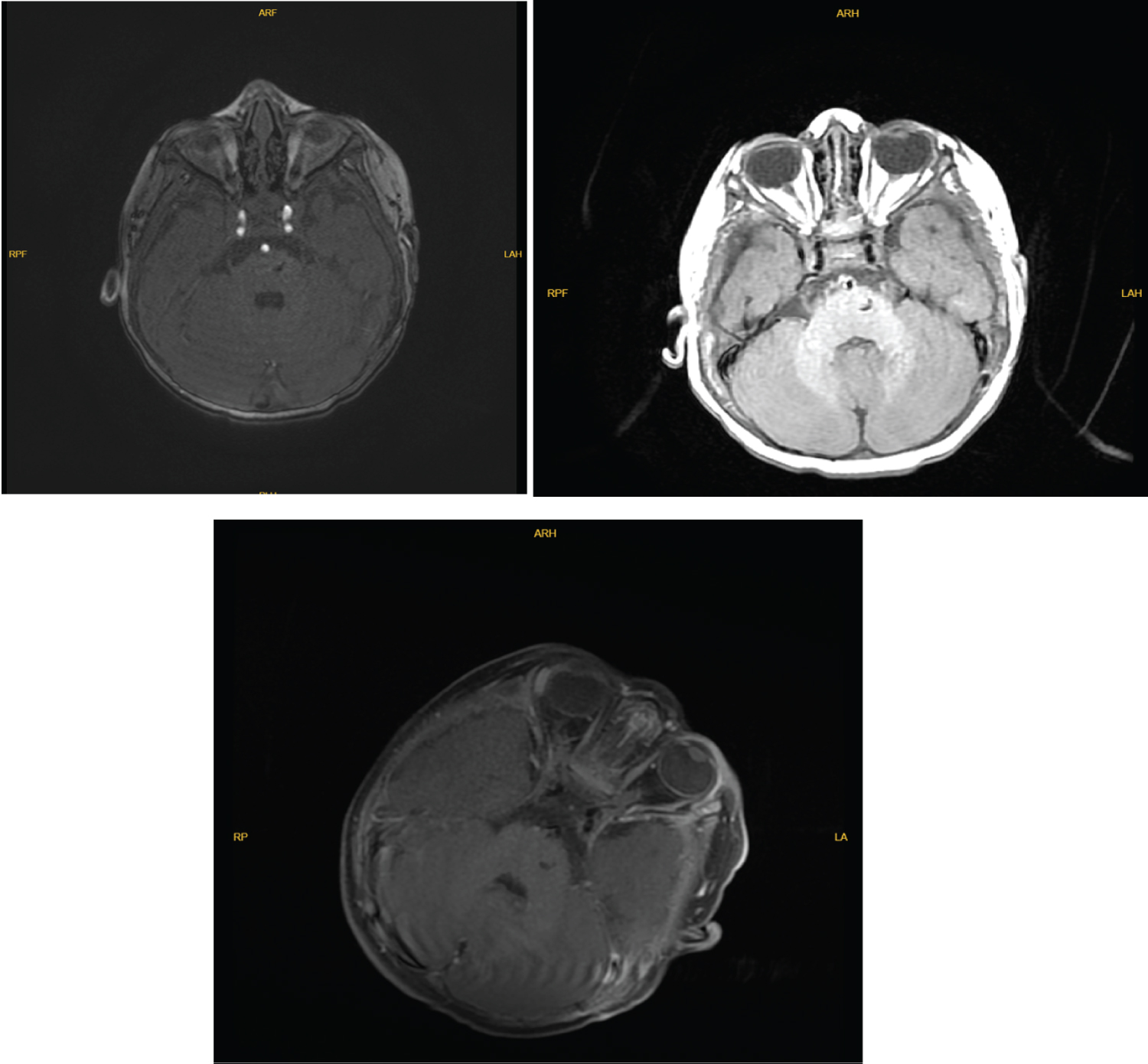 Blood tests were evaluated, and no pathologic value was seen. Magnetic resonance imaging (MRI) and angiography (MRA) was obtained which revealed a pontin mass along the dorsal aspect of the posterior fossa. The lesion is heterogeneously hyperintense on T1 and T2 weighted sequences (Figure 1 and Figure 2). The mass was well-circumscribed and heterogeneous, and evidence of previous hemorrhage within it. He was consulted to our department with preliminary diagnosis of pontine cavernoma and hemangioma. The differential diagnoses of an intracranial vascular lesion in this one year-day old infant included hemangioma, hemangioblastoma, vascular malformation, and other neonatal tumor types, such as soft-tissue sarcoma [8].