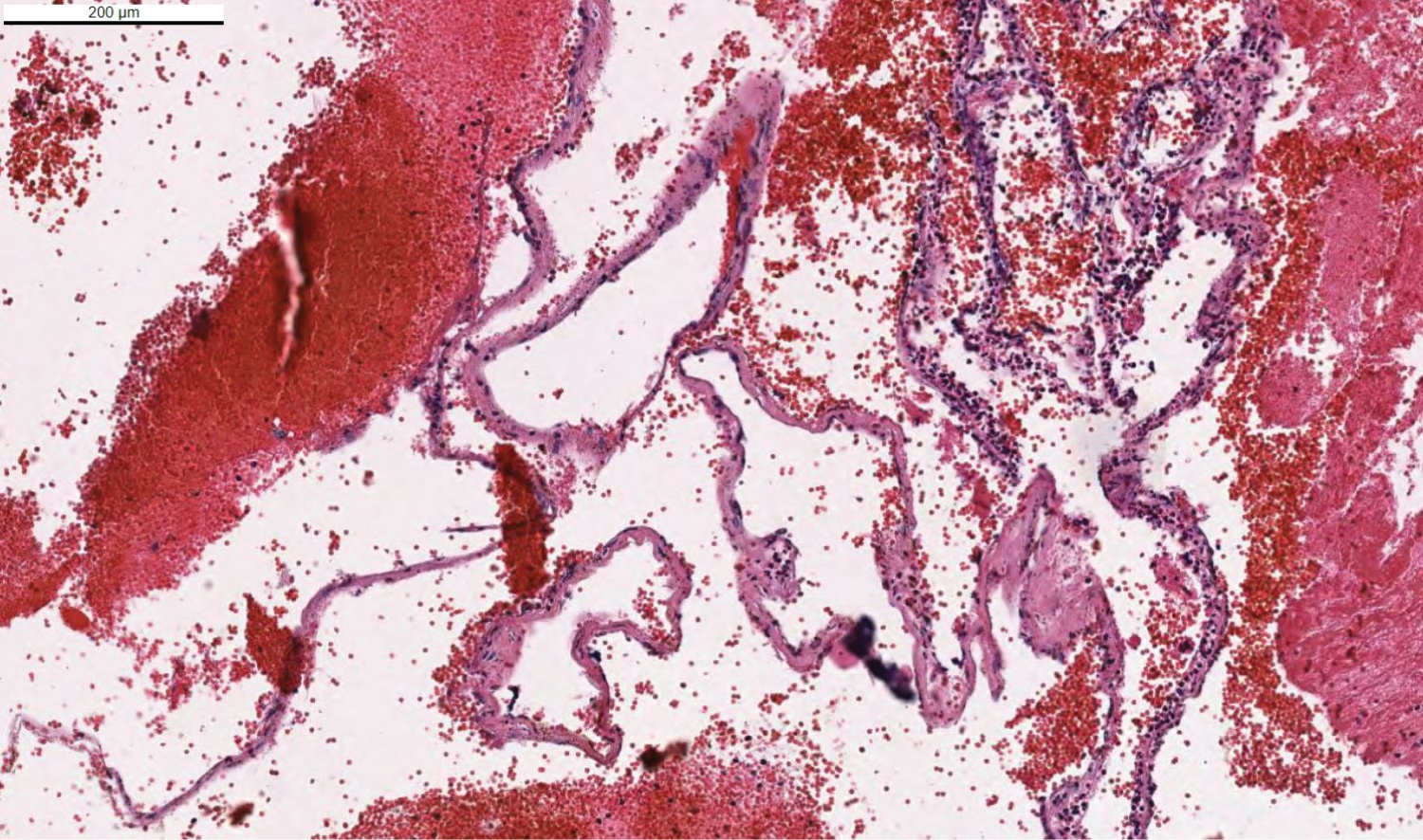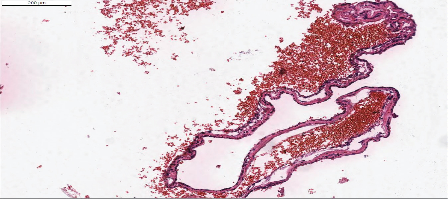 Figure 5: Pathology prepared slides showed congested vascular lesions which has thin walls with hematoxylin eosin dye. View Figure 5