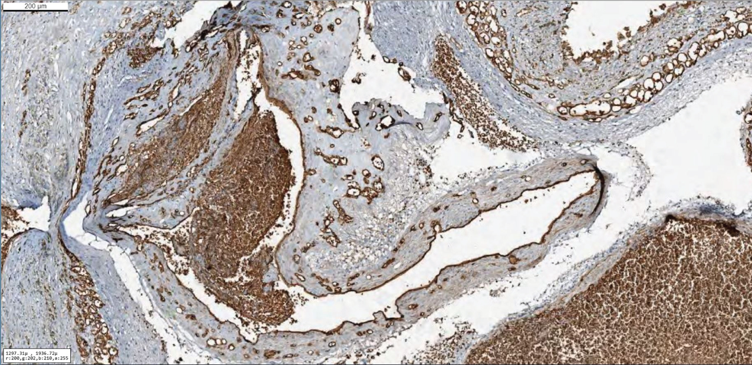 Figure 7: Immunohistochemically, Glut-1 dye showed expressions of the vascular wall and it's compatible with the infantile type hemangioma. View Figure 7