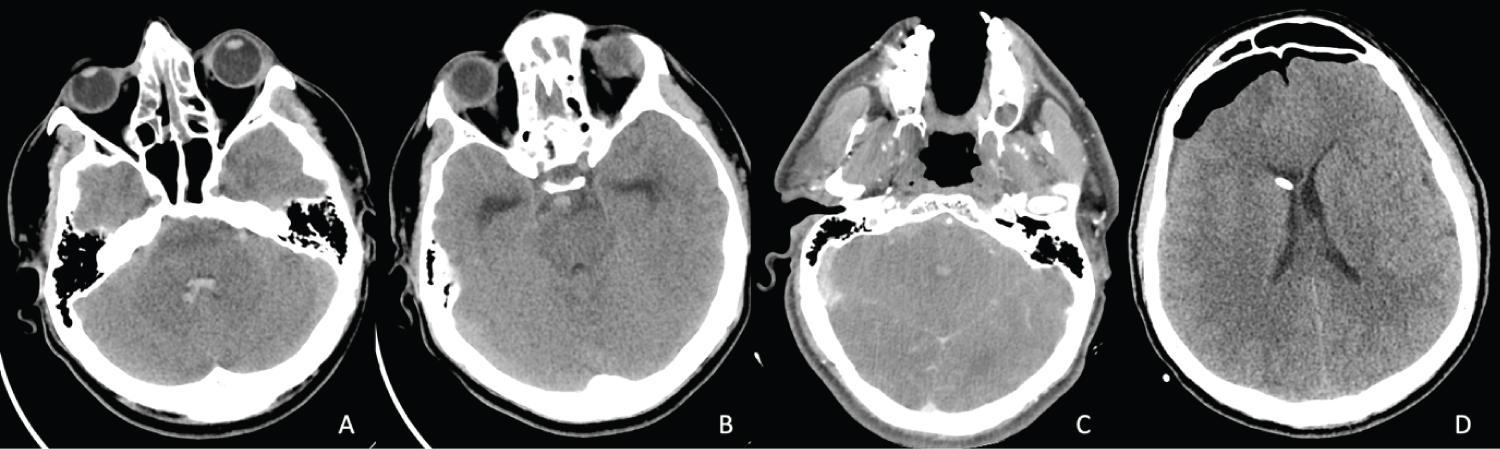 Figure 3: Head Computed tomography (CT) scans of case 3. (A,B) Initial Non-contasted CT scan demonstrating the acute subarachnoid hemorrhage anterior to the brainstem and inside the 4th ventricle; (C) CT angiography (CTA) that did not show any aneurysms or vascular malformations of the basilar artery and its branches; (D) postoperative CT scan showing the placement of the external ventricular catheter inside the right lateral ventricle, as well as a moderate amount of pneumocephalus after trephination. View Figure 3