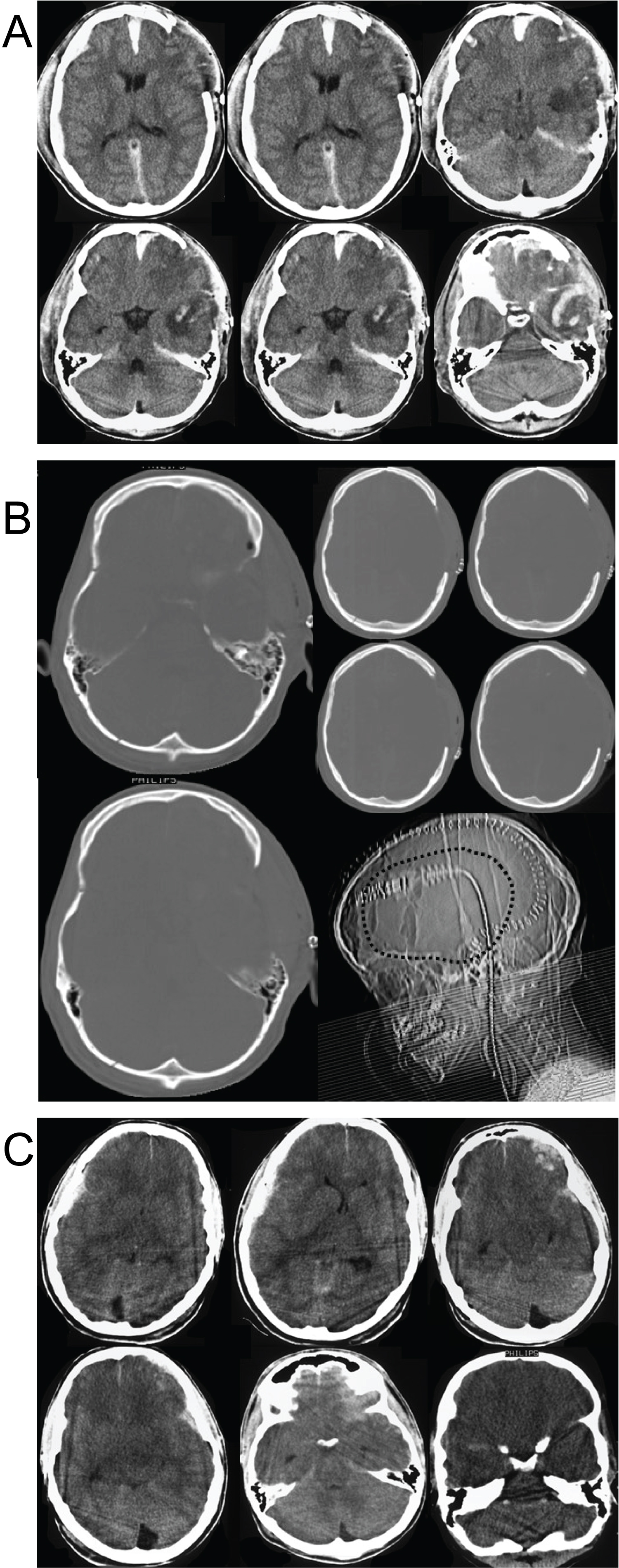 Inclusion criteria were the presence of a severe TBI according to a GCS lower than 8 and diffuse brain injury with generalized oedema without significant mass lesion on initial computerized tomography (CT) scans (Figure 1). Patients with large mass lesions were excluded from the study. The time span between the trauma and the operation was between 30 and 75 min. In accordance with our own management regime, initially, an intraparenchymal pressure transducer was routinely inserted into the frontal region to control ICP. If the initial ICP 30 mmHg or higher (especially with acute bilateral abnormal pupillary widening), immediate unilateral decompressive craniectomy (UDC) was performed (Figure 1).