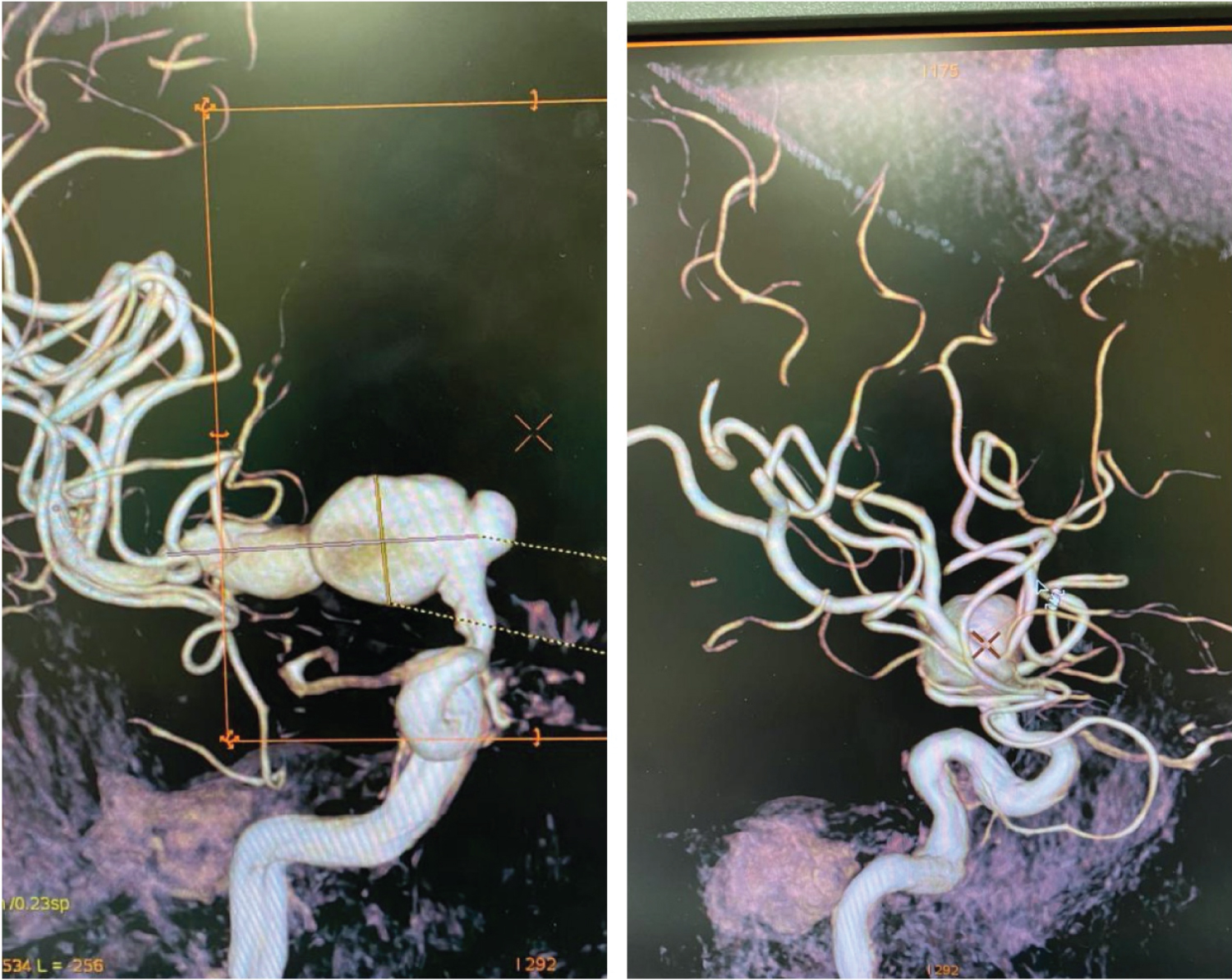 CT brain showed an acute subarachnoid haemorrhage, with the blood load distributed mainly in the right sylvian fissure. A large mass was noted in the region of the terminal internal carotid artery (ICA), with a suspicion of a giant aneurysm. CT angiogram was done, and a large fusiform dilation of the terminal ICA-proximal M2 region was noted, in keeping with a ruptured fusiform aneurysm. The patient's subarachnoid haemorrhage (SAH) was graded as Fisher 3, Hunt and Hess grade 3, World Federation of Neurological Surgeons grade 3.