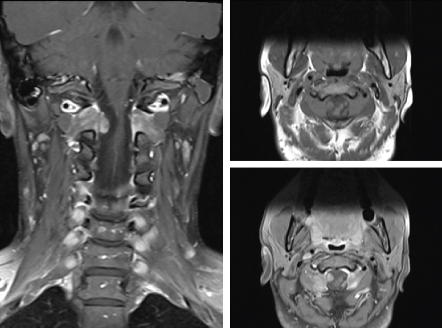 MRI of the brain and cervical spine was ordered, and it revealed enlarged dorsal root ganglia bilaterally at C2, C3 and C4 nerves. These were most prominent at C2 nerve roots bilaterally, with medial and anterior enlargement that extended intradurally and compressed the cervical spinal cord (Figure 1). Hyperintense signal on T2 sequences were noted on the cord at this level, consistent with myelomalacia. MRI of the brain was within normal limits. The patient consented to posterior C1-2 decompression and excision of the C2 nerve root tumours, with the possibility of C1-2 fusion if instability was created.