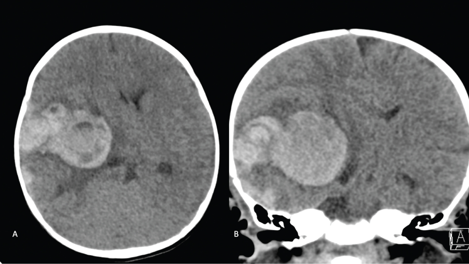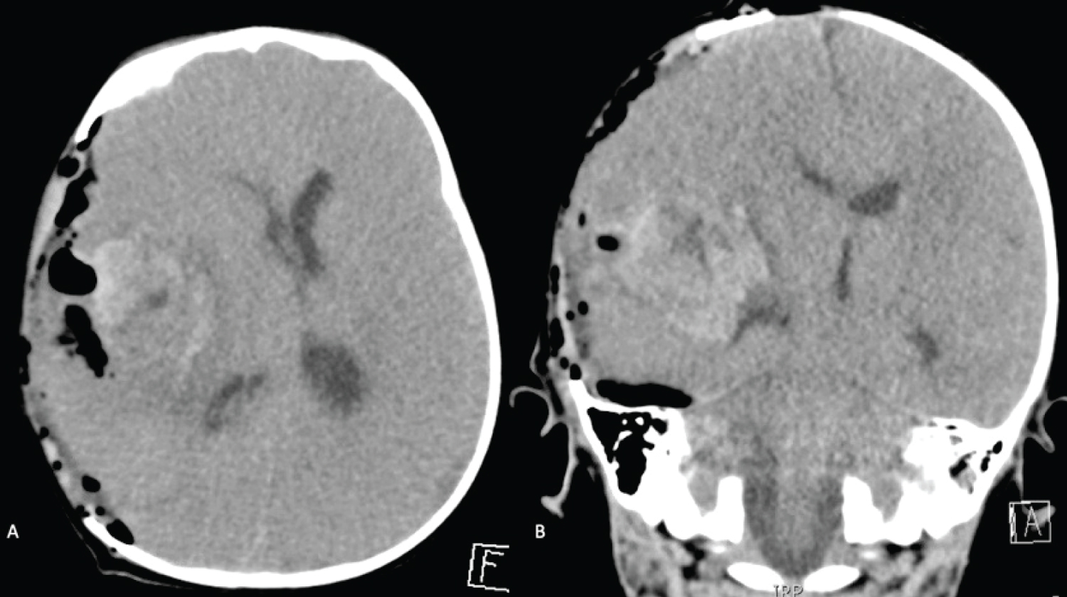 Figure 1: A) Non-Contrast Axial; B) Coronal. CT the head demonstrating a 5.6 × 3.7 cm acute intraparenchymal hematoma centered in the right basal ganglia with an associated 12 mm leftward midline shift and right sided uncal herniation with an asymmetrically enlarged temporal horn of the right lateral ventricle. There are also multifocal right frontal-temporal-parietal acute extra-axial hemorrhages as well as a right posterior falcine/tentorial subdural hematoma. View Figure 1