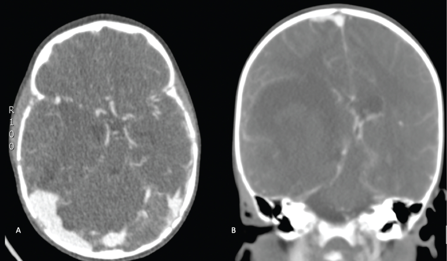 Figure 2: A) Axial; B) Coronal. CT Angiography: Demonstrating a right basal ganglia centric intraparenchymal hemorrhage causing mass effect with a 12 mm midline shift, right uncal herniation. There is no definite arterial blush suggestive of active bleeding within the hematoma. No suggestion of underlying vascular malformation. View Figure 2