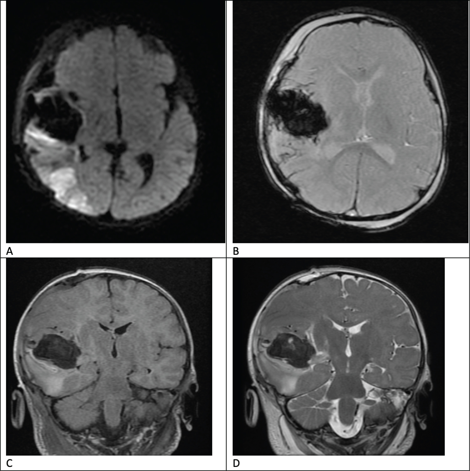Figure 5: Post-operative Magnetic Resonance Imaging (MRI) demonstrating ischemia of the right middle cerebral artery territory and residual hematoma with improved mid-line shift on various sequences. A) Axial Diffusion Weighted Image, B) Axial Gradient Recalled Echo (GRE), C) Coronal T2 Flair sequence, D) Coronal T2 Fast Spin Echo (FSE). View Figure 5