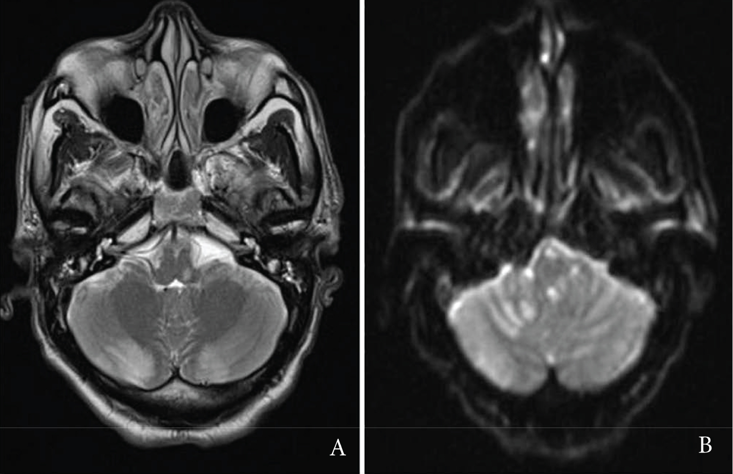 Figure 3: A) T2-weighted MRI axial slice demonstrating bilateral cerebellar ischaemia with associated oedema; B) MRI diffusion-weighted imaging demonstrating areas of acute infarction bilateral areas of infarction.
