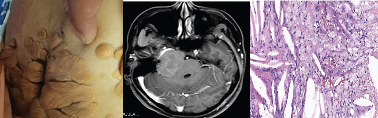 A 25-year-old female complained of right-sided facial paralysis and hearing loss for 4 years, and an intracranial mass was found for 1 week. The patient had a history of FH and excision of the left elbow mass; positive sign: The right eye is incompletely closed, the right frontal lines and nasolabial fold become shallow, right ear hearing loss, multiple masses are seen in the skin of the right popliteal fossa, sacral caudal (Figure 1a), and right elbow; MRI showed: Right middle posterior skull base mixed density mass; Focal bone destruction (Figure 1b); cholesterol (TC): 14.9 mmol/L, low-density lipoprotein (L-DL) 12.87 mmol/L, After admission, ezetimibe was taken orally to reduce blood lipid. All tumors were removed by retrosigmoid sinus approach under electrophysiological monitoring. Postoperative pathological report: Xanthoma (Figure 1c).