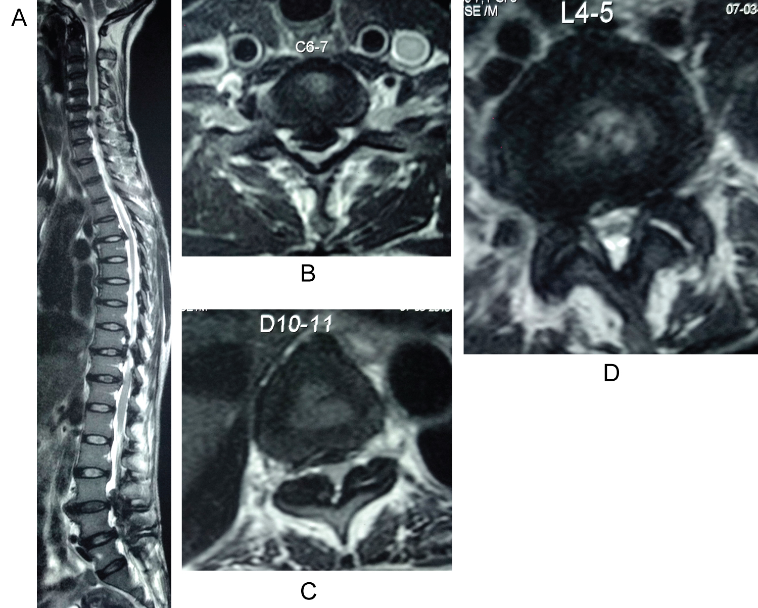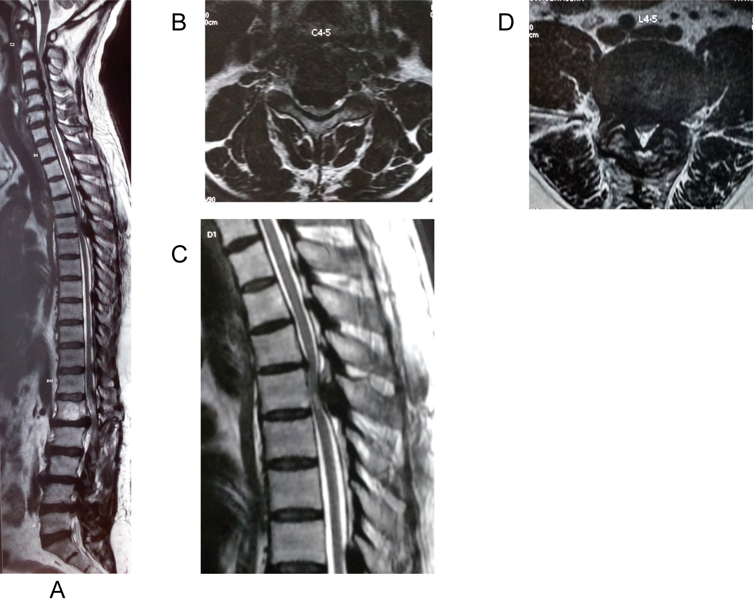 Management: In view of cord signals in cervical and thoracic spine, hyper-reflexia in all 4 limbs Posterior Cervical decompression (C3-T1 decompression with Lateral mass fixation) and thoracic decompression (D10-11 posterior decompression with Left facetectomy and fusion) was carried out in first stage in a same sitting by two spine surgeons simultaneously. Patients gait improved over 6 months from Nurick Grade 3 to Nurick Grade 2, but bladder symptoms didn't resolve. Patient gradually started having worsening of bilateral leg pain and claudication so was operated L4-5 posterior decompression after 6 months after trying conservative management (Figure 3).