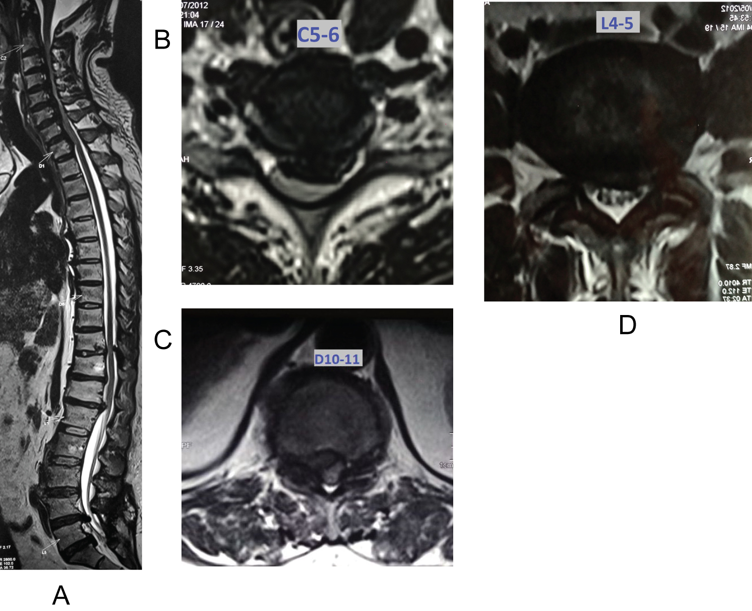 Management: Since spasticity was same in both upper and lower limbs, C5-6, C6-7 ACDF was carried out in stage one and L3-L5 Microscopic posterior decompression was carried out in stage two, 4 days later. Staged procedure was carried out keeping the co-morbidities of the patient in mind. Following the procedure, Patients' gait imbalance improved to a great extent by 8 months with Nuric grading improving to Grade 1 from Grade 3, with no bladder/bowel complaints. As a result, thoracic decompression was not carried out and the patient has been on a close watch for 1.5 years post op (Figure 1).