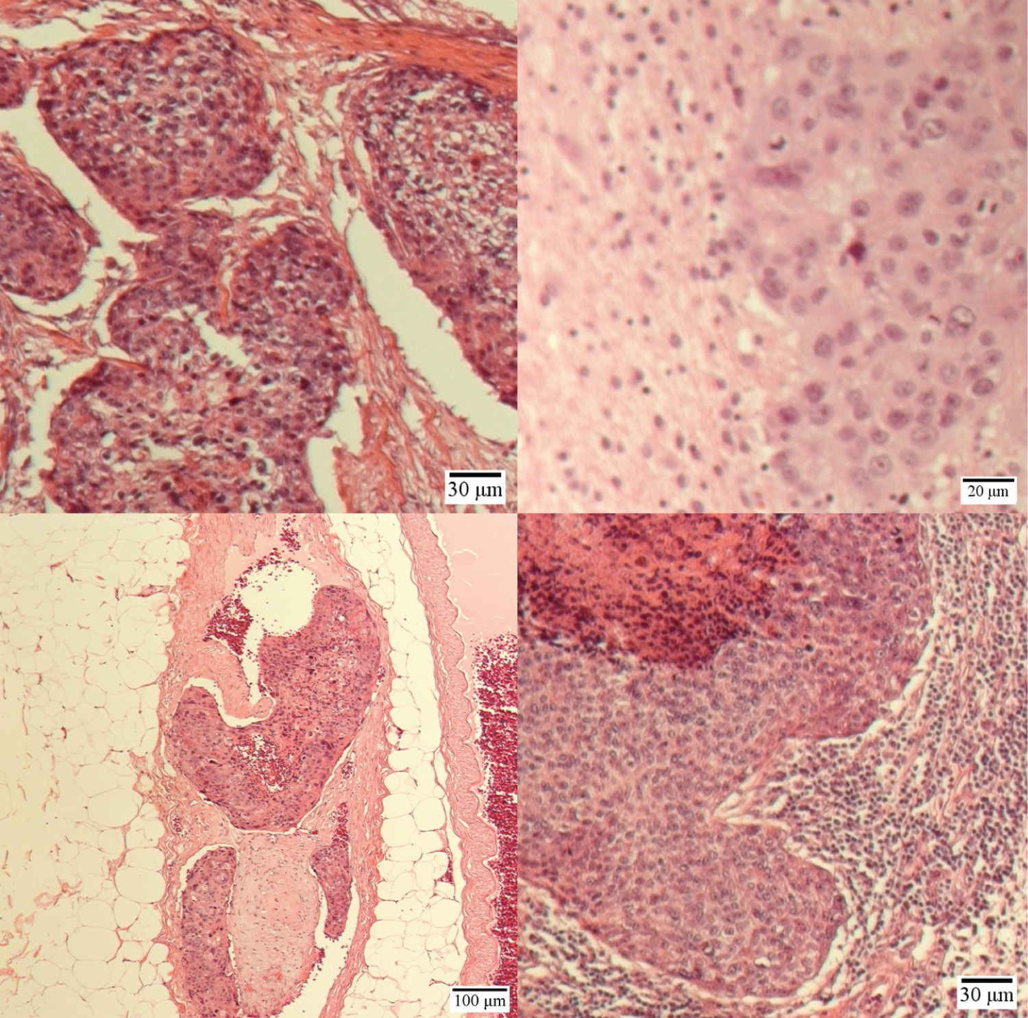 Figure 2: Histopathological comparison of tumour specimens from various sites of resection. Top left panel: Chest wall lesion resected in 2016 at 50× magnification; Top right panel: Cerebral metastasis and adjacent neural tissue resected in 2020, from the left frontal lobe at 100× magnification; Bottom left panel: Chest wall lesion resected in 2016, showing extensive invasion of a blood vessel by tumour with tumour thrombus at 50× magnification; Bottom right panel: Metastatic deposit in an axillary lymph node resected in 2016 at 50× magnification. Note the central necrotic material and surrounding lymphoid tissue. The tumour cells in all panels demonstrate marked cytological and nuclear atypia, absent intercellular bridges, and minimal/absent keratinisation, characteristic of anaplastic squamous cell carcinoma.