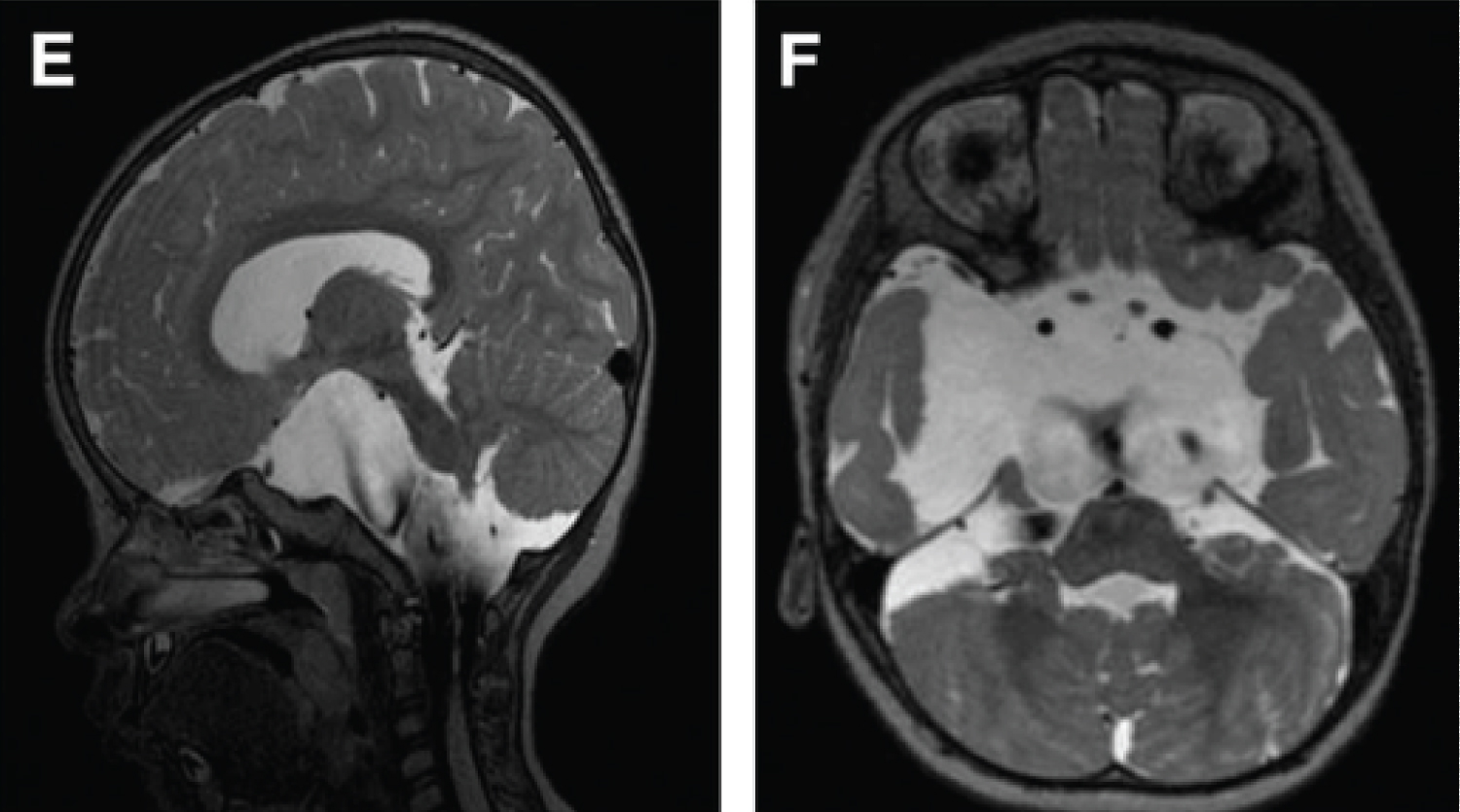 Figure 2: SAC - 2 come from a defect of the mesencephalic leaf of the membrane of Lilliequist, causing a dilatation of the interpeduncular cistern without a hydrocephalus but with a compression of the upper part of the brainstem. They are often diagnosed antenatally and do not always require surgery. However, they tend to cause endocrine disorders due to the mass effect.