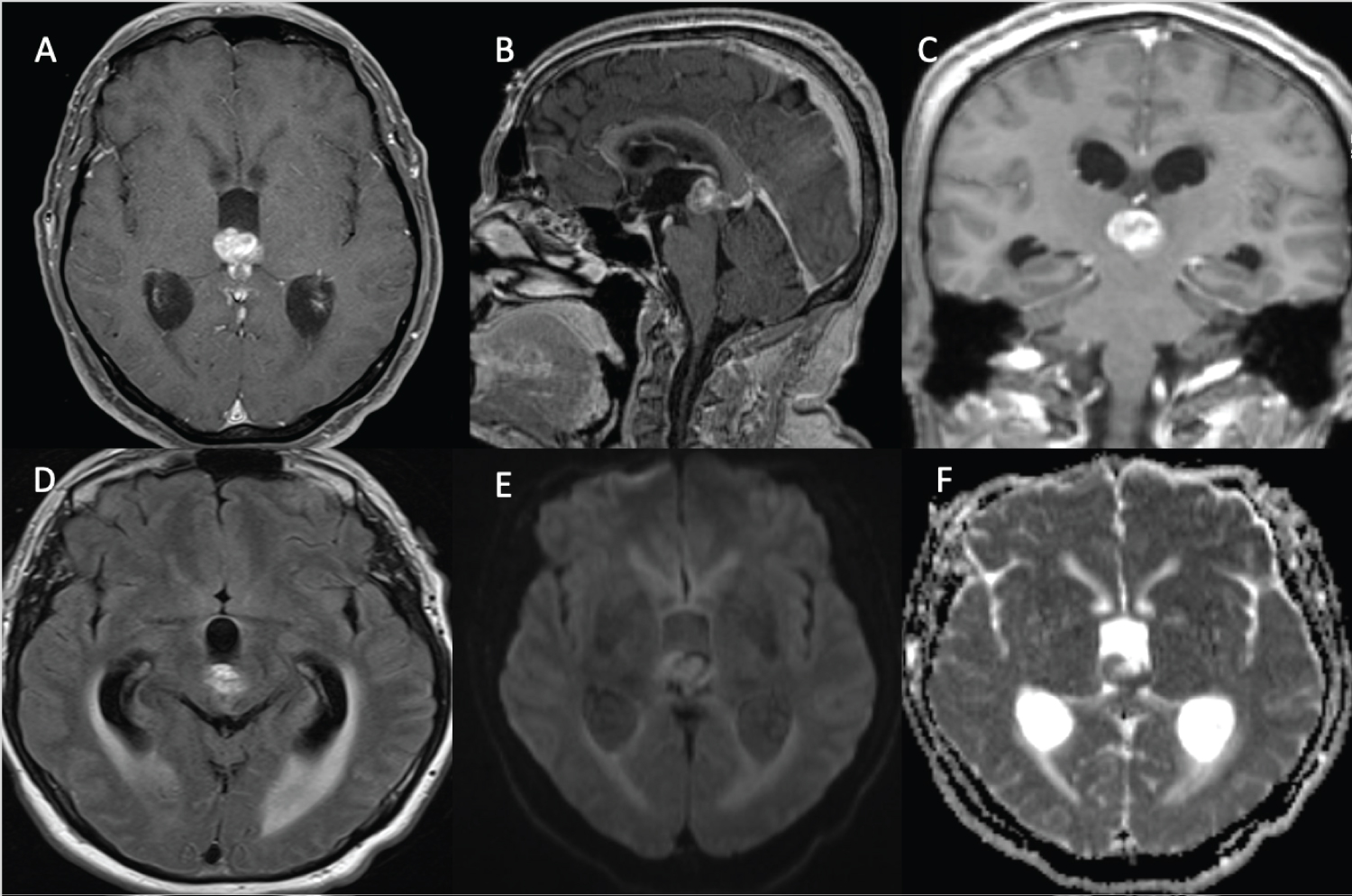 Figure 1: Intraventricular/Pineal melanoma metastasis. (A, B & C) axial, sagittal and coronal T1 with GAD shows heterogeneously enhancing third ventricular/pineal region mass. (D) Axial FLAIR demonstrates mild ventriculomegaly with ballooning of third ventricles and trans ependymal flow secondary to the mass. (E & F) Axial diffusion-weighted imaging (DWI & ADC) demonstrates peripheral diffusion restriction. Findings are compatible with intraventricular/pineal region metastatic melanoma.
