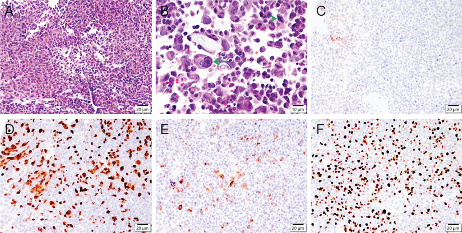 Figure 2: Intraventricular/pineal region tumor pathology. Microphotographs of the biopsied tissue shows a patternless tumor (A) composed of epithelioid cells with large irregular nuclei containing prominent nucleoli (B, arrow) and mitosis (B, arrowhead). Immunohistochemistry reveals minimal staining of synaptophysin (C), focally positive S100 (D) and Melanoma cocktail (E), and a markedly high Ki67 proliferation index (F). Scale bars: 20 μm (A, C-F), 10 μm (B).