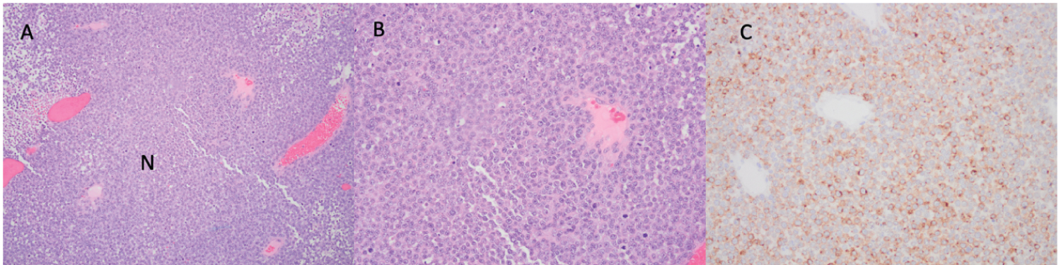 Figure 4: Intraventricular tumor pathology. (A) 100x H&E staining demonstrating largely amelanoticfocal necrosis; (B) 200x H&E staining showing frequent mitoses; (C) 200x Immunohistochemistry is positive for melanoma cocktail.