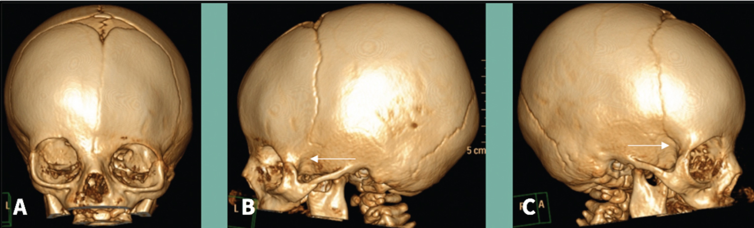 Figure 3: A) Three-dimensional CT reconstruction shows frontal; B,C) Lateral views. The arrow in image B represents left frontosphenoidal fusion and in C a right frontosphenoidal suture patency.