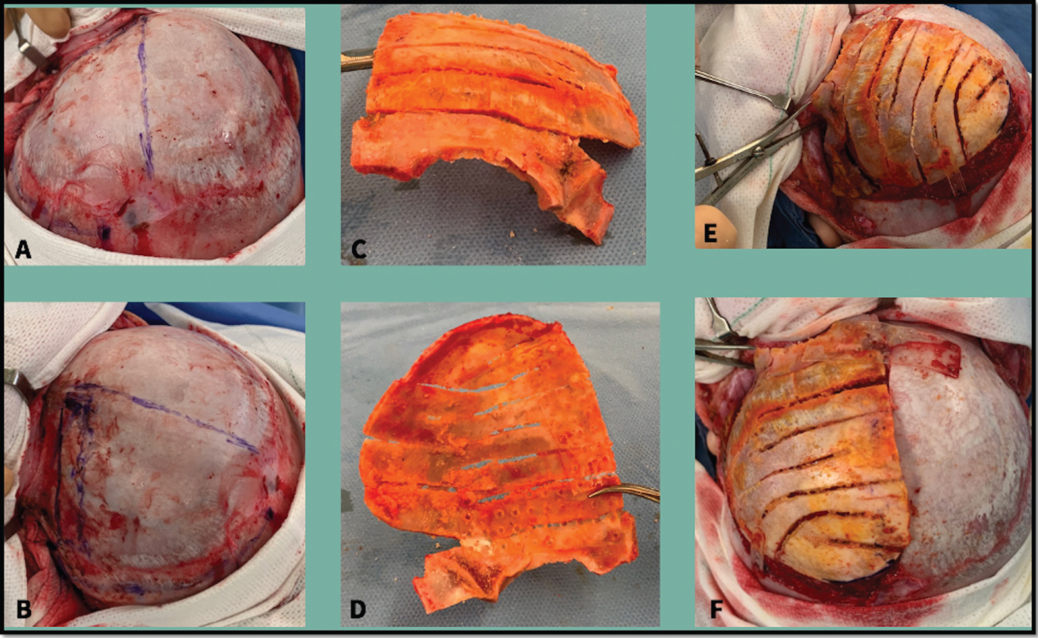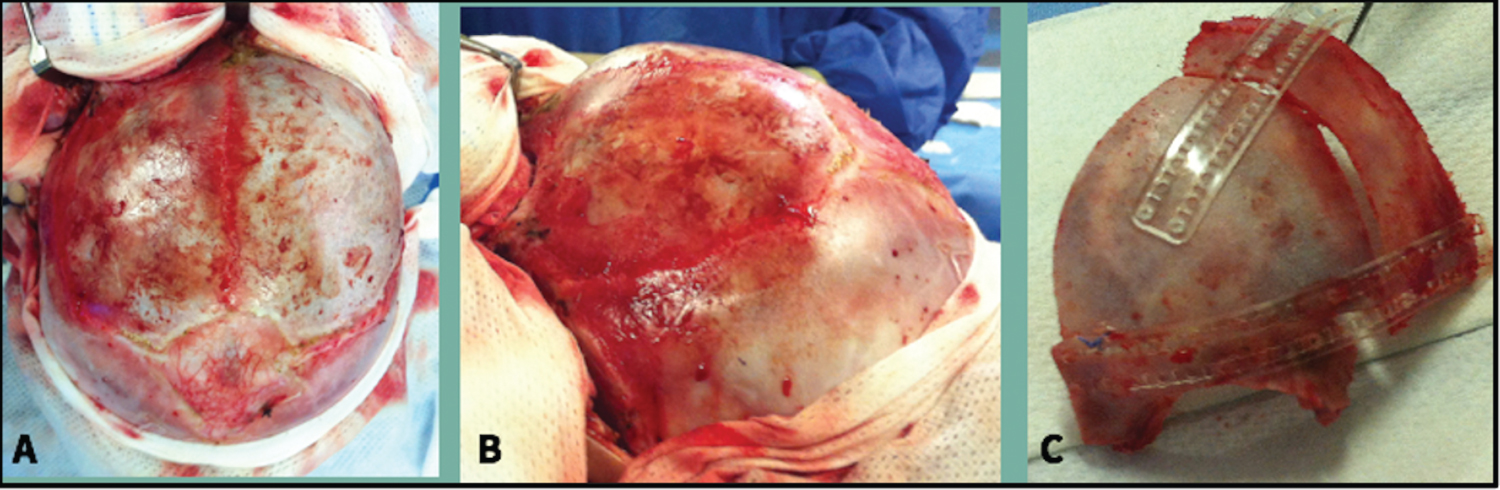 Figure 7: A) Three-dimensional CT reconstruction shows a coronal craniosynostosis with ipsilateral retrusion of the forehead and elevation of the superior orbital rim; B) Intraoperative picture represents the outline of the craniotomies; C) Repositioning and fixation of the reshaped bifrontal bone and correction of the supraorbital rim.