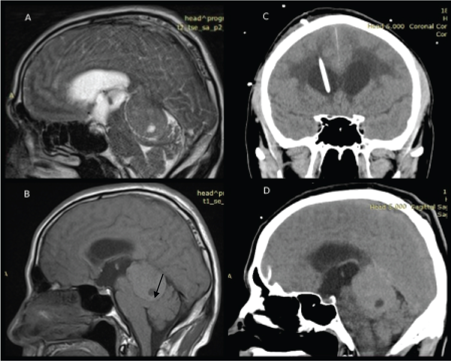 Figure 1: A) MRI shows encapsulated 4.25 × 3.15 × 2.89-cm in size tumor with hyper-signal intensity on T2WI, and heterogeneous slightly long/short signal on T1WI; B) The area of necrosis is also shown (arrow); C) Coronal CT scan of the patient after the placement of external ventricular drainage; D) Sagittal CT scan of the head showing solitary, irregularly contoured mass. To note, these CT scans were made 10 days later after the initial MRI scanning with signs of slight tumor increase.