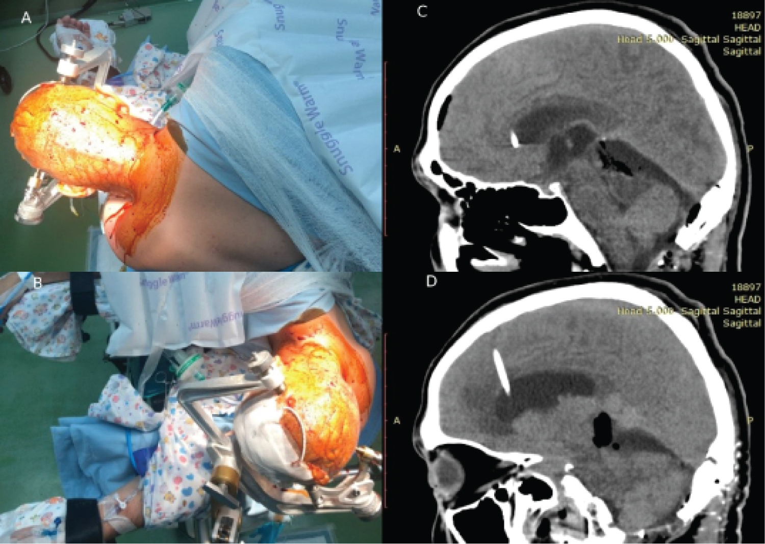 Figure 2: A,B) Patient position and the incision line are shown; C,D) Sagittal CT scans after gross total resection. The operative route is seen. No signs of complications.