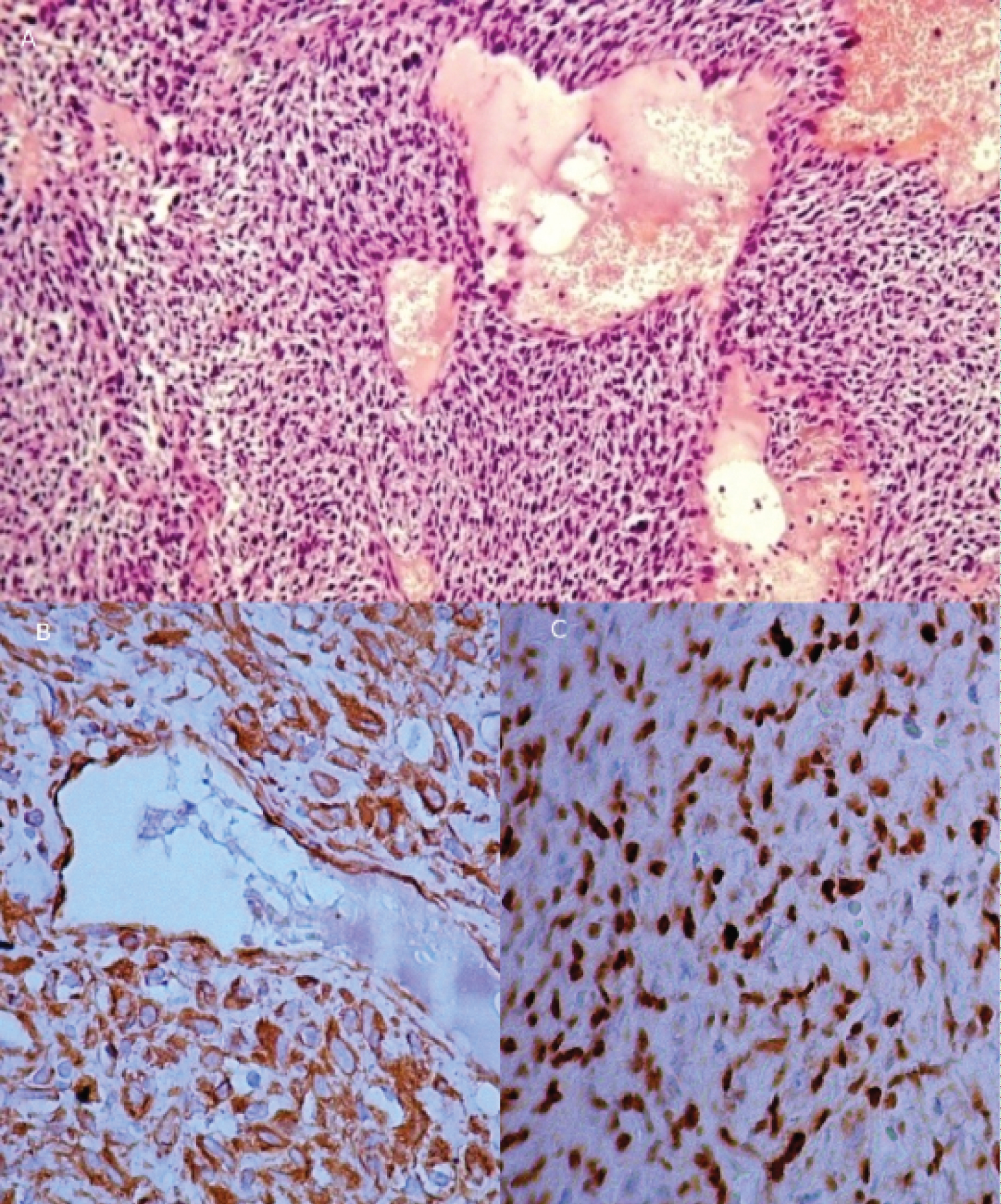 Tumor tissue was represented by rather dense sprawls rounded, oval, less often spindle-shaped cells, with dark hyperchromic cores. The cytoplasm was eosinophilic, and nuclei contained signs of pathological mitosis. There were numerous sinusoidal slits, capillaries, vessels, and vascular slits like "staghorn" lined with endothelium between cells. Large-scale hemorrhages and foci of necrosis were also seen (Figure 3A).