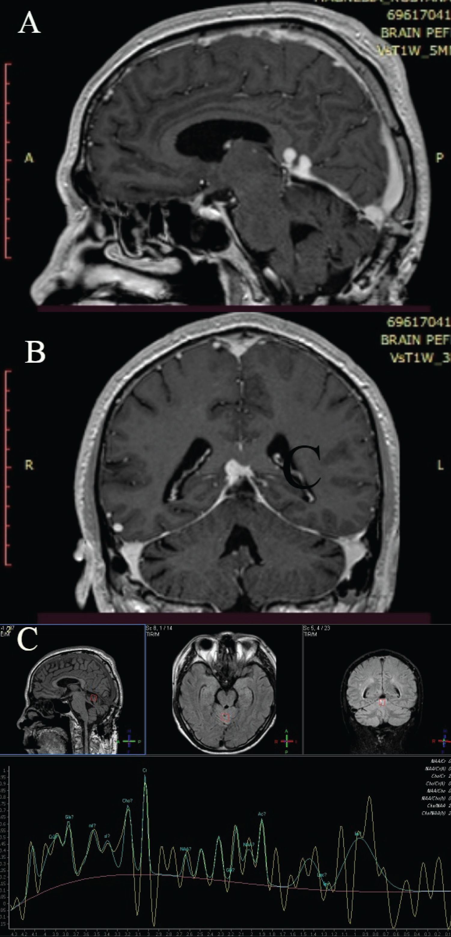 Figure 4: Postoperative follow-up. A) Sagittal T2WI image that shows supratentorial part; B) Coronal T2WI image; C) Conventional MR spectroscopy that shows increased creatinine.