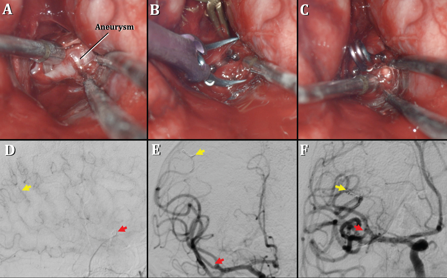 D), E), F) Post-clipping digital cerebral angiography. D) Lateral projection displaying the location of the aneurysm clip in relation to the bifurcation of the upper branch of M2 (red arrow) and migrated coils in the right angular artery (yellow arrow). E), F) Anteroposterior projection showing absence of residual aneurysmal sac (red arrow) and persistence of distally migrated coils (yellow arrow).