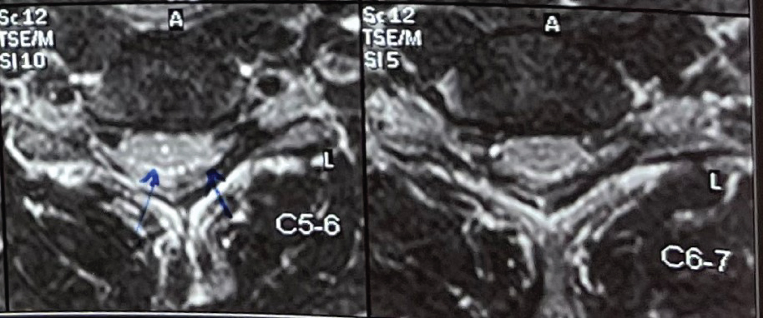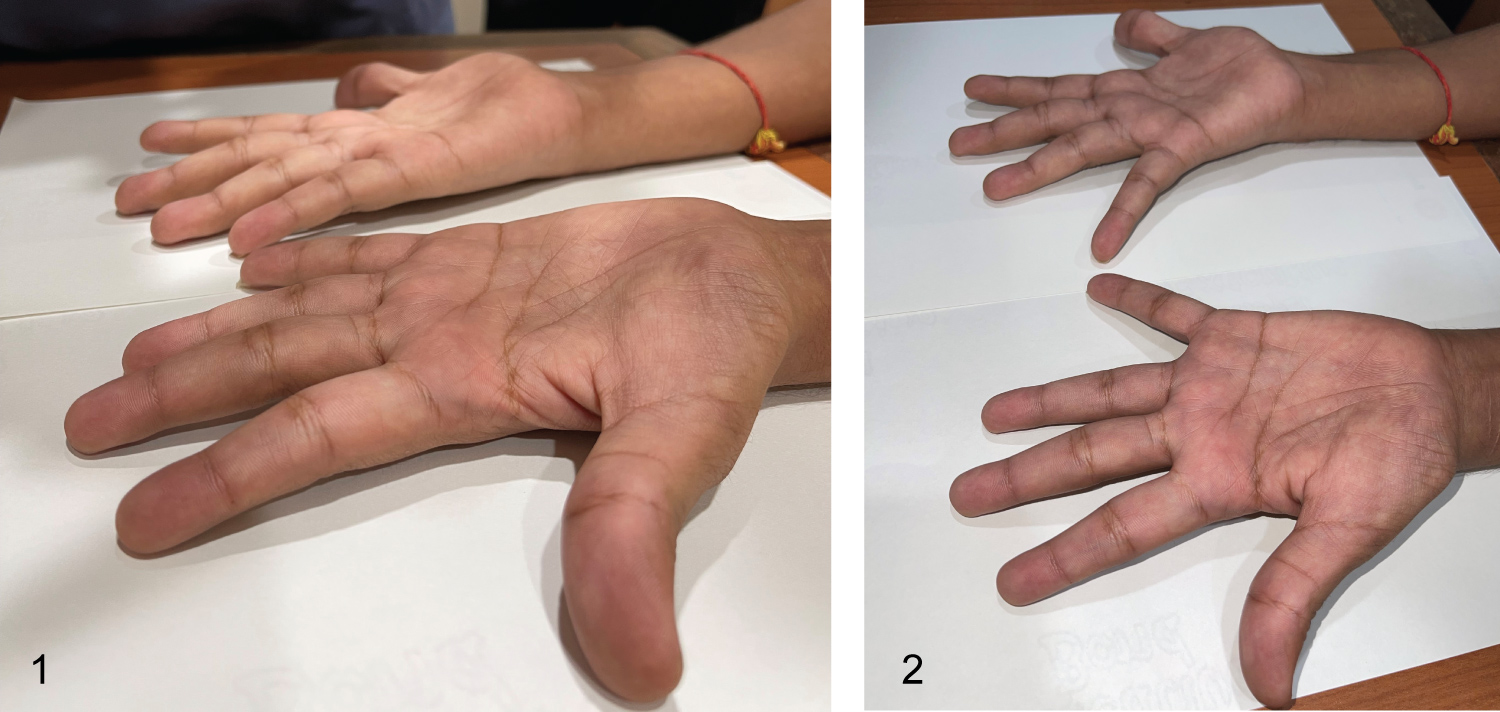A twenty-one-year-old male right-handed came to us with a chief complaint of weakness in the grip of both hands (right > left) which was noticed by him in August 2020 when he was gathering clay with his bare hands to make a Ganesha idol. He experienced that this weakness was static and non-progressive and was not related to any aggravating or relieving factors. The patient also had a history of occasional tingling in both of his hands since childhood which was left unattended. The patient started noticing the loss of the bulk of his bilateral hand muscles. The patient did not have weakness in proximal upper limbs or any of the lower limbs. He did not have any complaints regarding bowel and bladder habits. On examination, we found wasting of thenar as well as hypothenar muscles (Figure 1 and Figure 2). The patient had asymmetric weakness in all his intrinsic muscles (3/5) of both hands. All the sensations were well preserved and deep tendon reflexes were normal. The nerve conduction studies, and EMG findings were suggestive of bilateral C8-T1>>C7>>C5-C6 very chronic motor axon degeneration with the site of involvement likely to be at anterior horn cell or cord level. His MRI of the cervical spine (Figure 3, Figure 4 and Figure 5) was showing focal atrophy of the lower cervical spinal cord from C5-C6 to C6-C7 disc levels with mild prominence of the central canal and on flexion, there was the ventral movement of posterior dura with the prominence of the posterior epidural venous plexi extending from C3 to upper dorsal levels. All these findings were suggestive of Hirayama disease. The patient was advised to wear a cervical collar and on follow up after two months he had relief from his tingling and there was an improvement in power (4/5) of intrinsic muscles of both hands. He was able to write in reasonably good handwriting and was able to perform all his routine activities without any disturbances.