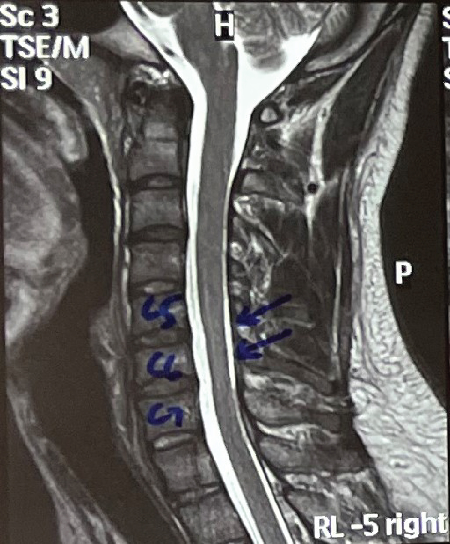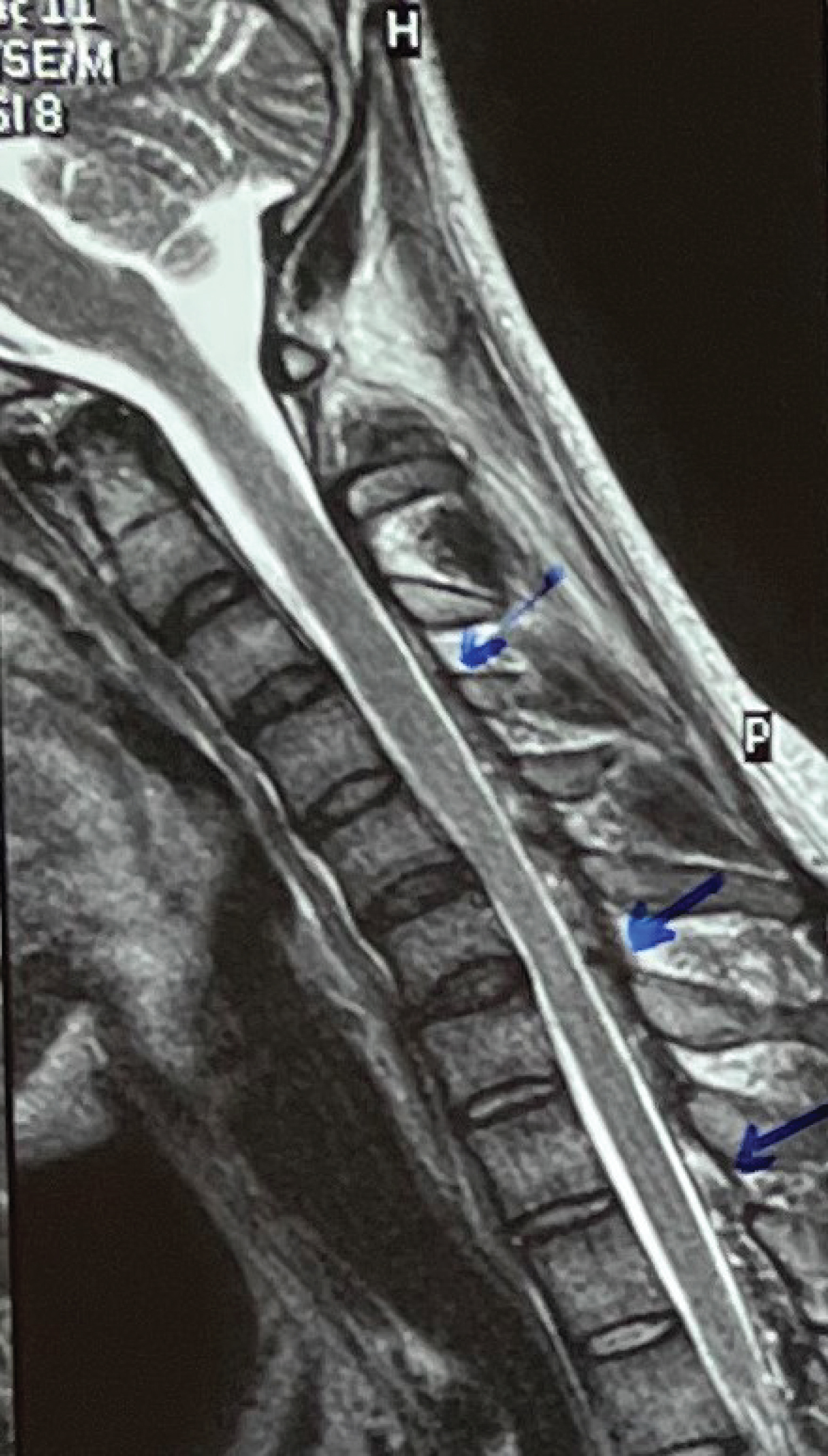 Figure 4: Sagittal T2 image after neck flexion showing the ventral movement of the posterior dura with the prominence of the posterior epidural venous plexi extending from C3 to upper dorsal levels (Shown with blue arrows).