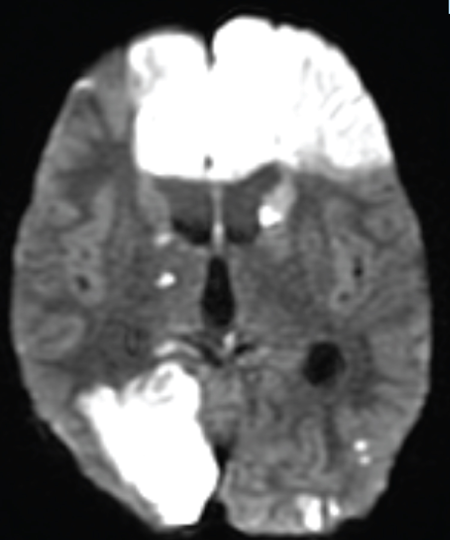 Figure 4: DWI image shows signal changes in the frontal and occipital lobes.