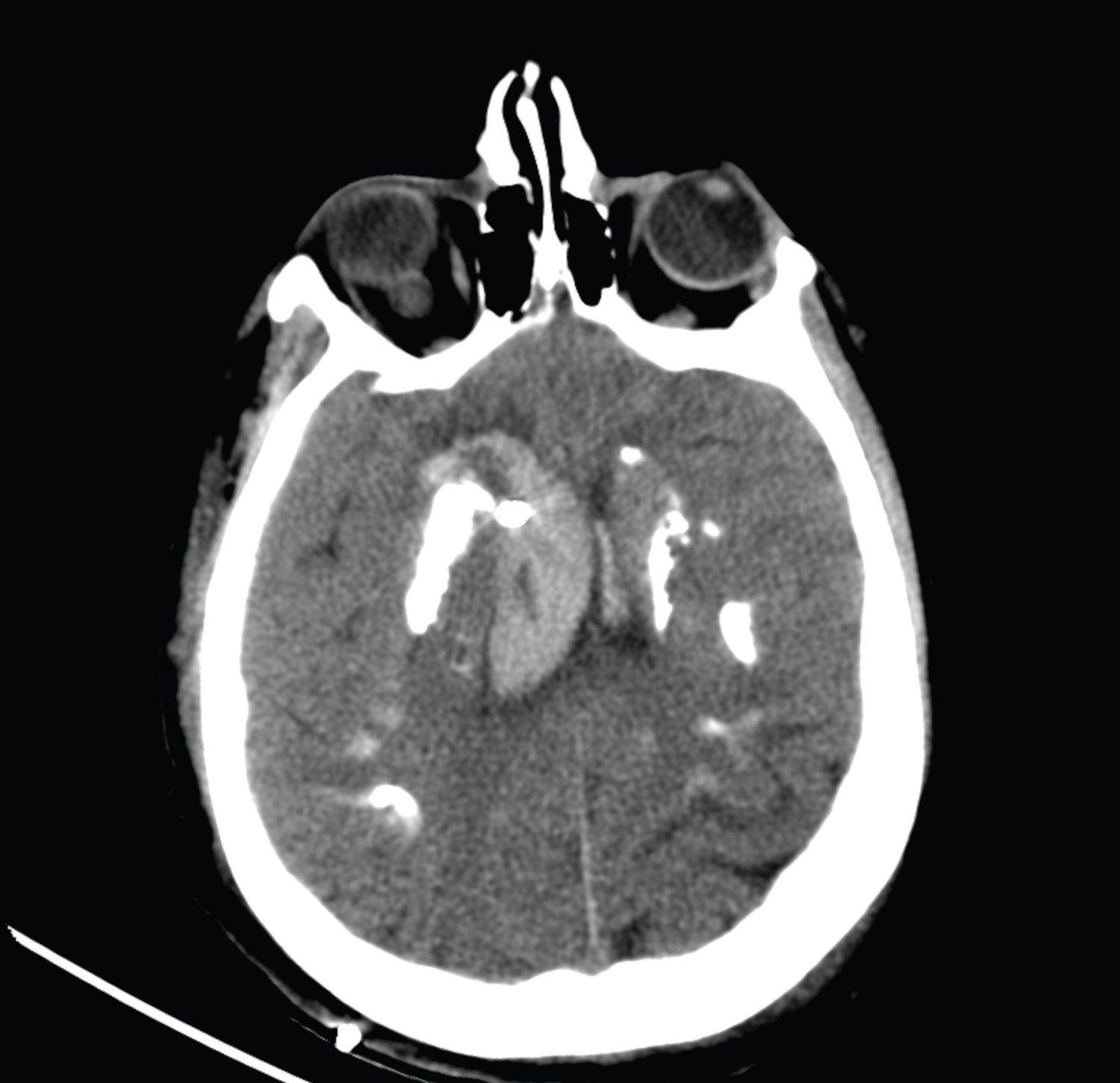 Figure 2: Control brain tomography after external ventricular drainage for drainage of existing bleeding.