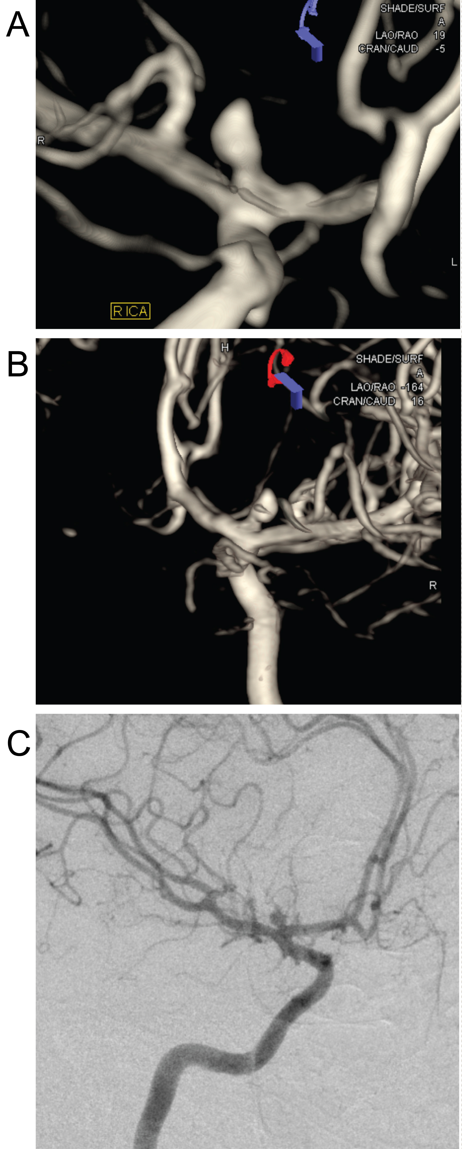 Figure 3: DSA image showing saccular aneurysmatic filling with a diameter of 5*3 millimeters at the apex of the Right Internal Carotid Artery, just before the M1 segment of the Middle Cerebral Artery.
