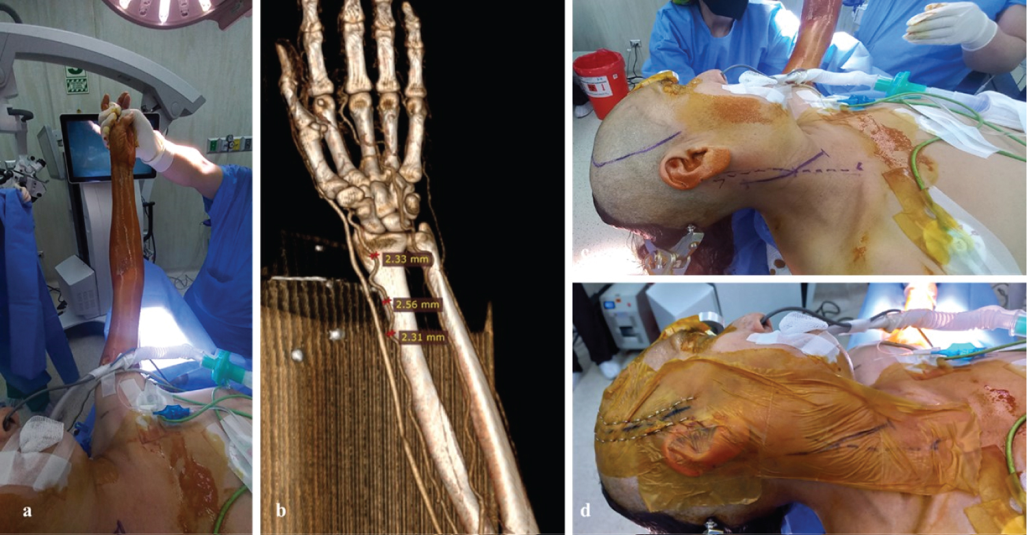 Figure 2: a) Preparation of the left upper limb to proceed with graft collection; b) 3D reconstruction allows to determine the anatomy of the donor vessel (left radial artery); c,d) Head placement and positioning, marking of cranial and cervical approach areas.