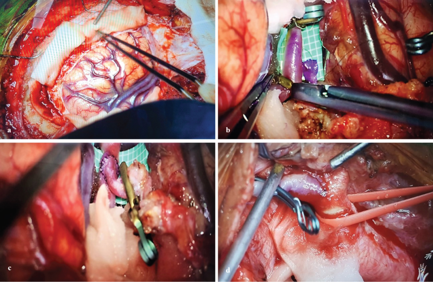 Figure 3: a) Right frontotemporal craniotomy with approach to the Silvian valley; b,c) Lateral term anastomosis between distal M2 - RA; d) Dissection and preparation ACE where distal anastomosis will be performed AR-ACE.