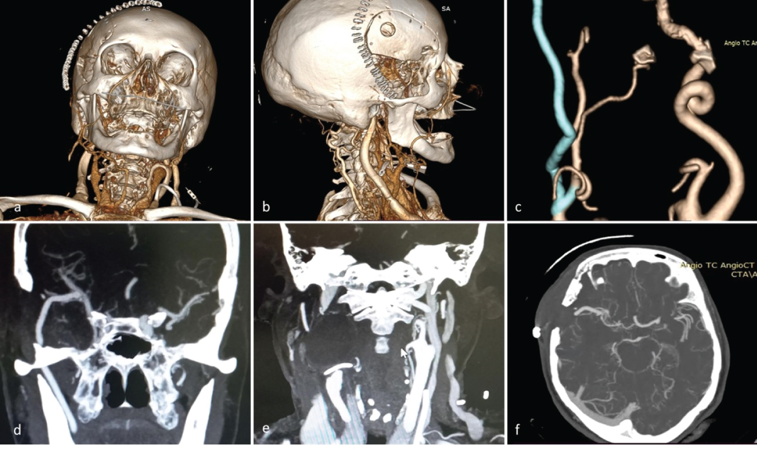 Figure 4: Post-surgical angiotem. a,b) 3D reconstruction evidences absence of extracranial ACI C1 aneurysm; c) 3D reconstruction of high-flow bypass with AR graft; d) Evidence permeable anastomosis AR - M2; e) Clip in ACI and exclusion of the aneurysm; f) Axial cut shows permeability of the high-flow bypass.