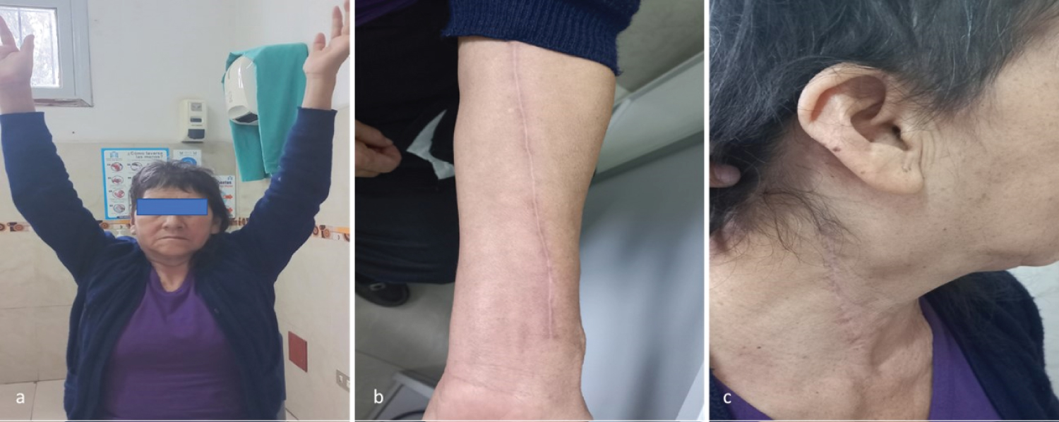 Figure 5: Patient with good evolution. a) Limb mobilization and preserved strength; b) Adequate healing in the region of RA graft taking; c) Adequate cervical scarring and decreased volume of cervical mass.
